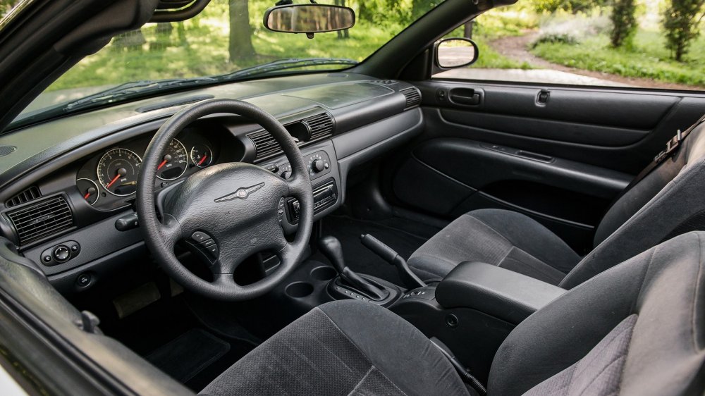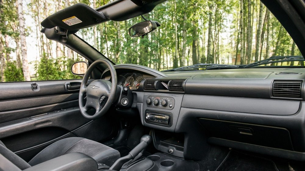 Интерьер Себринга – хороший шанс вспомнить традиции американского автопрома начала двухтысячных. Вертикальная передняя панель отлита из гулкого пластика. Крупные кнопки и переключатели, непременные подстаканники на центральном тоннеле, бирюзовая подсветка приборов. Для полного погружения в атомосферу истинного фуллсайза не хватает подрулевой кочерги «автомата» и обширной отделки «пластиковым деревом». И если первое в ориентированной на Европу модели было изжито «крайслеровцами» как класс, то отсутствие второго – не что иное как признак начальной комплектации.