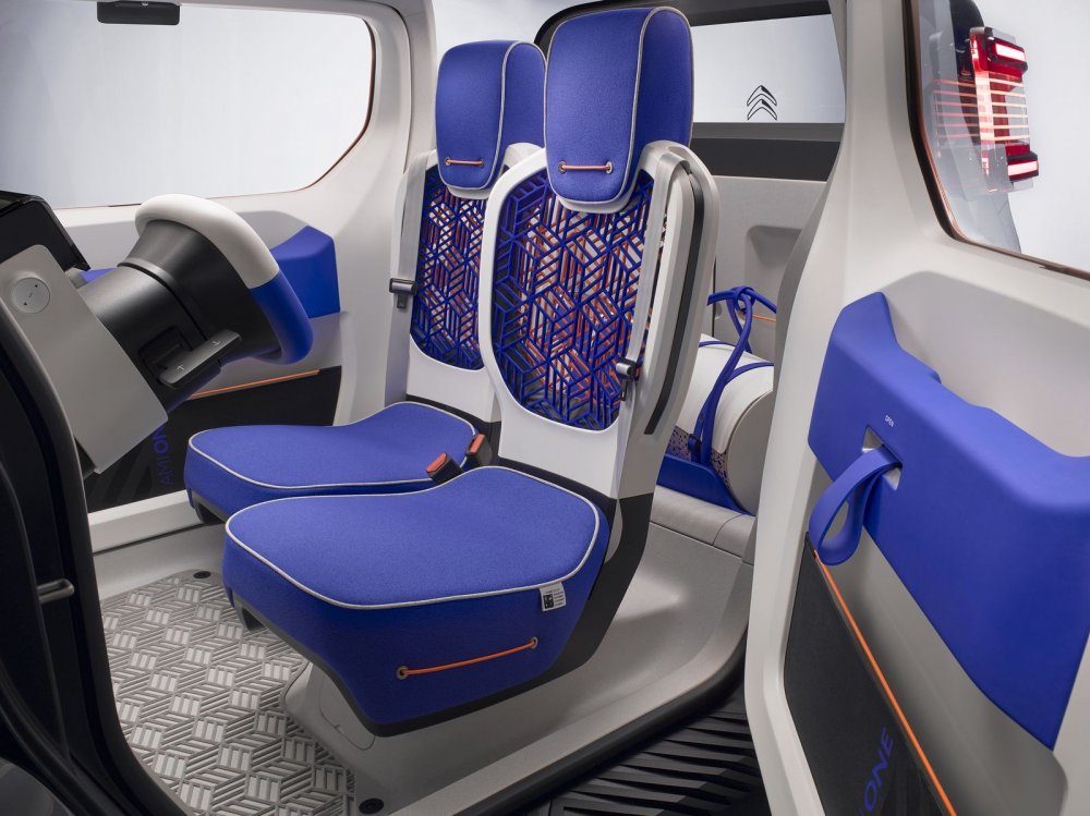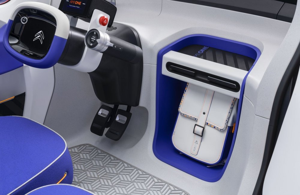Ami One – это очень компактный (длина – 2,5 м, ширина – 1,5 м, высота – 1,5 м) городской электромобиль на двоих, в конструкции которого заложены принципы 2CV, а именно максимальная дешевизна и практичность, но без примитивизма. У Ami One симметричные двери, фурнитура (вместо ручек используются ремешки с QR-кодом), бамперы (разумеется, фирменные мягкие Airbump) и кузовные панели, что упрощает их производство и ремонт. Легкие кресла с плетёными спинками слегка смещены друг относительно друга, чтобы седоки не толкались локтями. Во внутренней отделке много голого пластика, а в качестве щитка приборов используется смартфон водителя. Гаджет кладётся в специальную коробочку с индукционной зарядкой перед рулём, а изображение с него через скачанное заранее приложение транслируется на 5-дюймовый экран с анимированной мультяшной графикой, при этом навигационные подсказки отражаются в выкидном зеркальце, то есть образуются две компактные информационные зоны.
