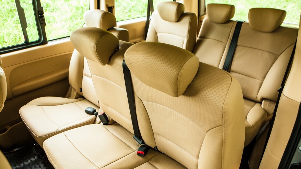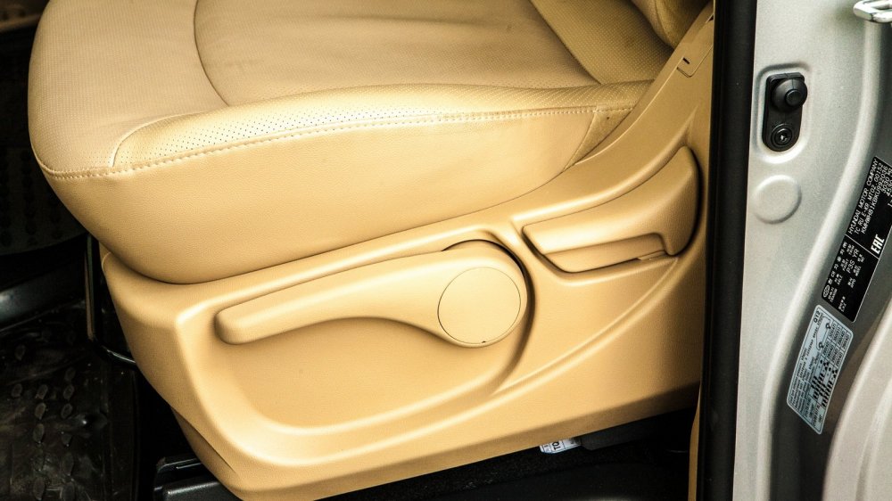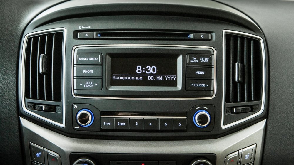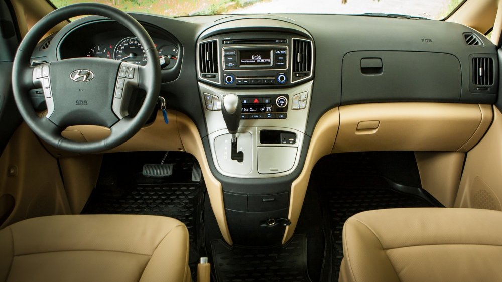 Начнем с первого ряда сидений. Вот здесь сразу видно, что нынешний Н1 – это модель десятилетней давности. То есть, с одной стороны, все вроде бы неплохо: и пухлый подогреваемый руль большого диаметра вполне удобен, и кожаные сиденья оснащены не только подогревом, но и вентиляцией. Но как-то очень уж все скромно... Мы уже привыкли, что на центральной консоли даже весьма бюджетных автомобилей красуется медиасистема с большим сенсорным экраном и навигацией. А тут топовая комплектация за 2 389 000 рублей, а у магнитолы — маленький монохромный дисплейчик, не способный показать ничего, кроме волны, на которую настроено радио, даты и времени. Между тем, корейцы как смогли добавили «современности» в винтажный микроавтобус. К примеру, изображение с камеры заднего вида выводится на на салонное зеркало заднего вида. Не может похвастаться богатством информации и крохотный (и тоже монохромный) экранчик бортового компьютера. Но вот я отрегулировал водительское сиденье и с огорчением обнаружил, что левая рука удобно ложится на подлокотник двери, а правую девать некуда: «капитанских» подлокотников нет, причем не только непосредственно в комплектации Business, но и в списке доступных опций.
