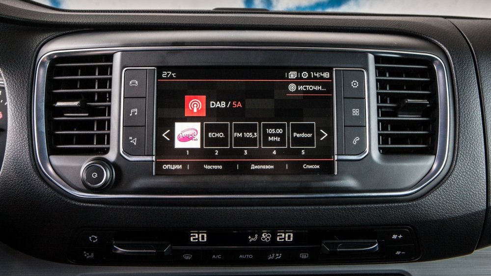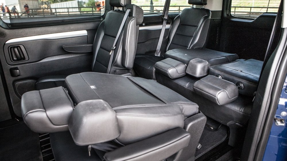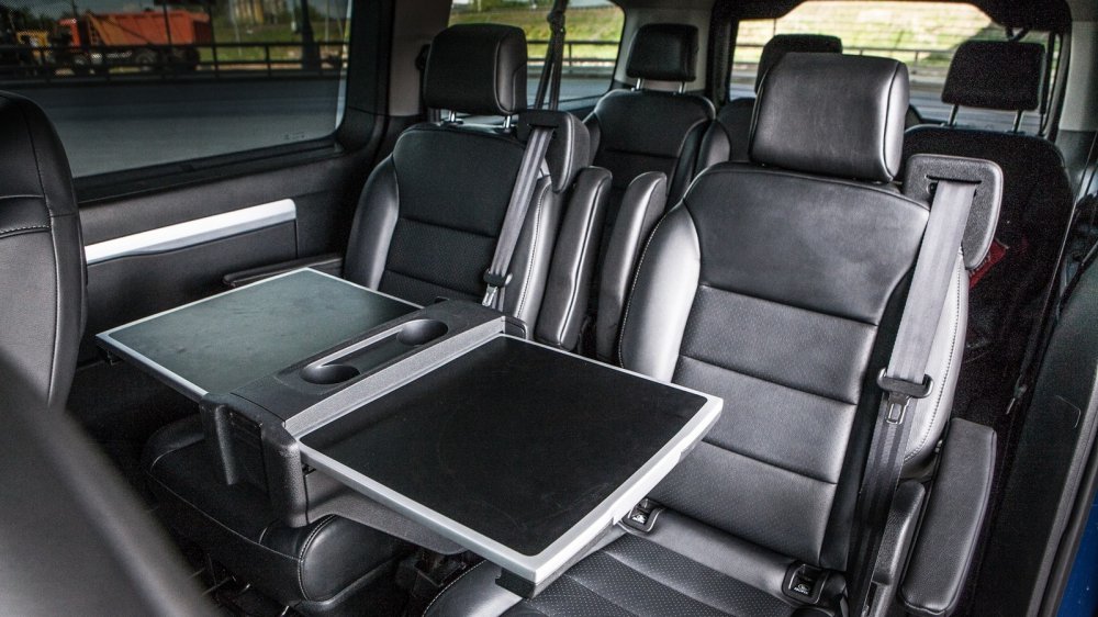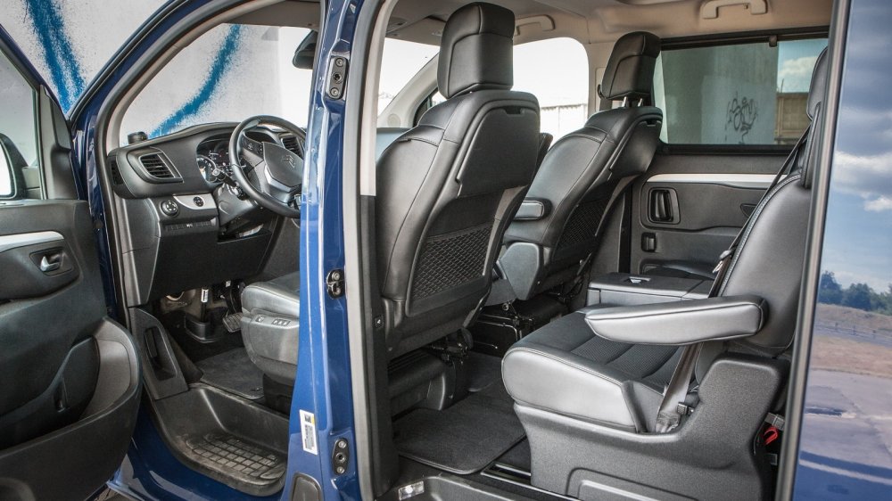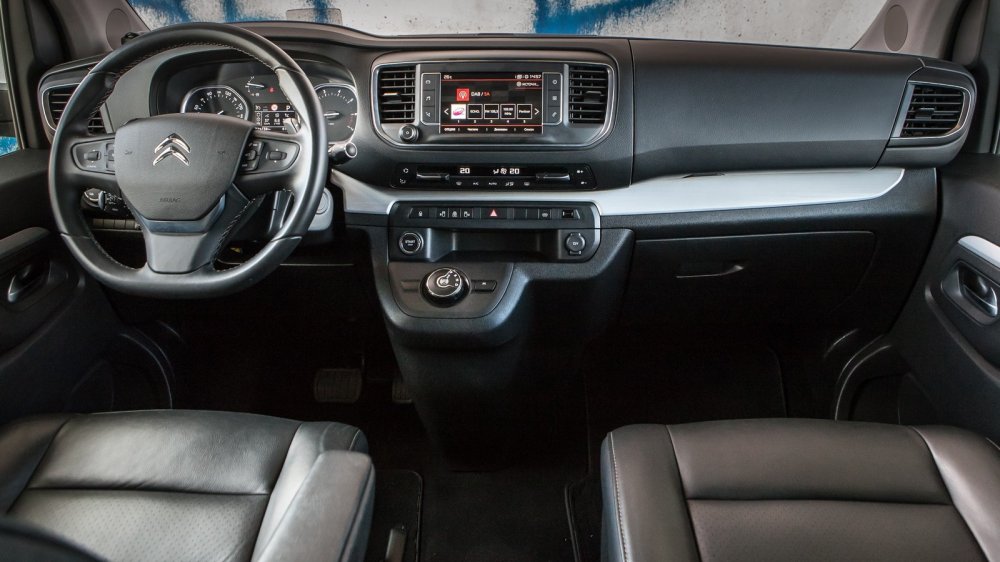 А теперь пересаживаемся за руль Citroen SpaceTourer. Эге, да разве это «француз», украшенный двойным шевроном, а не вэн из Штутгарта с трёхлучевой звездой? Здесь, конечно, нет ни натурального дерева ценных пород, ни ультрадорогой кожи, однако это вам и не Майбах-переросток. Архитектура салона куда интереснее корейской, а накладка из сатинированного алюминия добавляет хайтековые нотки. Пятиугольные аналоговые приборы выглядят современно — опять же, в отличие от корейских, а их возможности дополняет проекционный дисплей, позволяющий не отрывать взгляд от дороги. Руль буквально «влипает» в руки, обзорность вперед — выше всяких похвал, а обилие всяческих ящичков, ниш и полочек способно вызвать пароксизм восторга даже у человека, привыкшего тащить в автомобиль кучу полезных мелочей. Только в карманы передних дверей помещается по три (не одна, не две, а три!) полуторалитровых бутылки с водой. А вот подстаканники в SpaceTourer расположены не так удобно, как в Hyundai Н1.