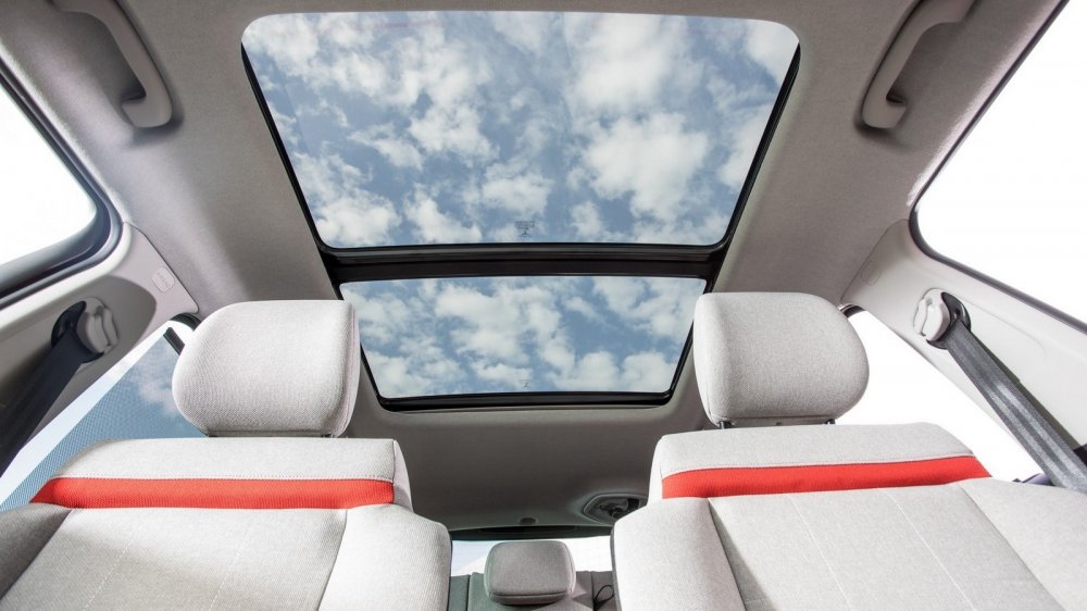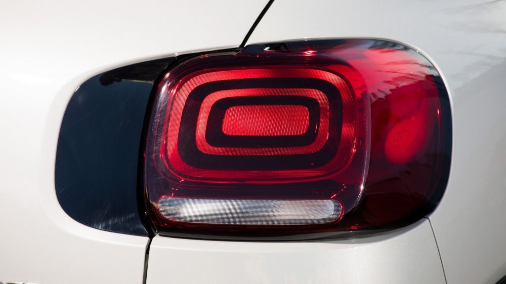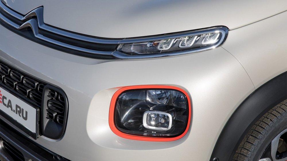 Главная тема в дизайне C3 Aircross (если не считать корпоративной облицовки радиатора в виде двух хромированных планок с «интегрированным» изображением стилизованных шевронов в центре и плавно переходящих в узкие полосочки ДХО по краям) — сжатая с четырех сторон окружность, ну, или если хотите, четырехугольник с очень сильно скругленными углами. Так оформлены нижние блоки двухэтажных фар, нижняя часть облицовки радиатора, задняя светотехника, вставки в защитные накладки на передний и задний бампер и даже спицы легкосплавных колесных дисков. Есть и другие очень любопытные детали — например, рейлинги на крыше со своеобразными «рожками» и оформленное «под жалюзи» стекло между третьей и задней стойками. Кстати, стекло это — вовсе даже никакое и не стекло. Как и фонари кабин современных истребителей, эта прозрачная деталь изготовлена из поликарбоната.