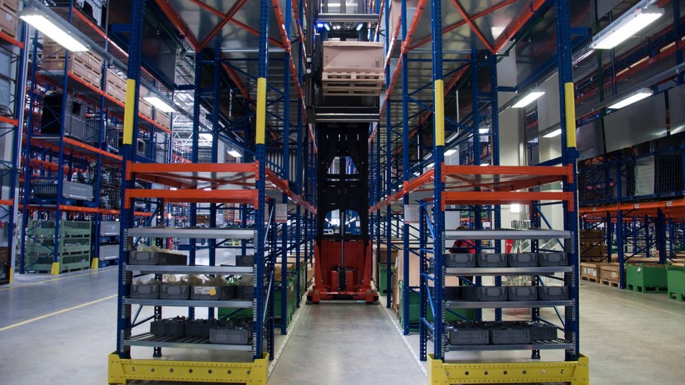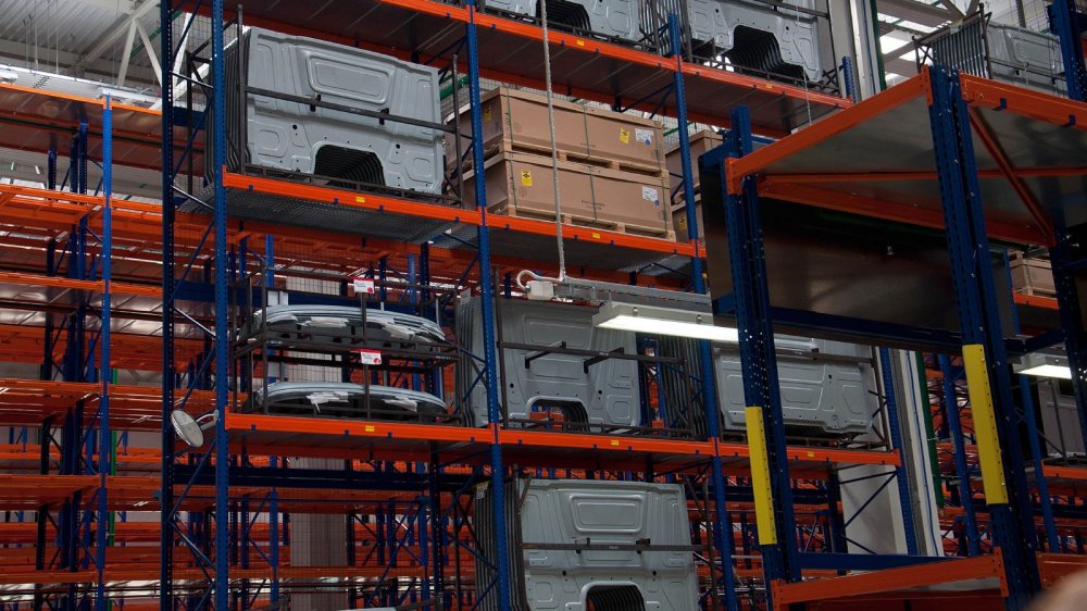 Остаётся посмотреть только цех логистики, но там, если честно, ничего нет. Очень узкие проходы для экономии места, по которым ездят штабелеры и тележки. Точность и скукота — больше сказать нечего.