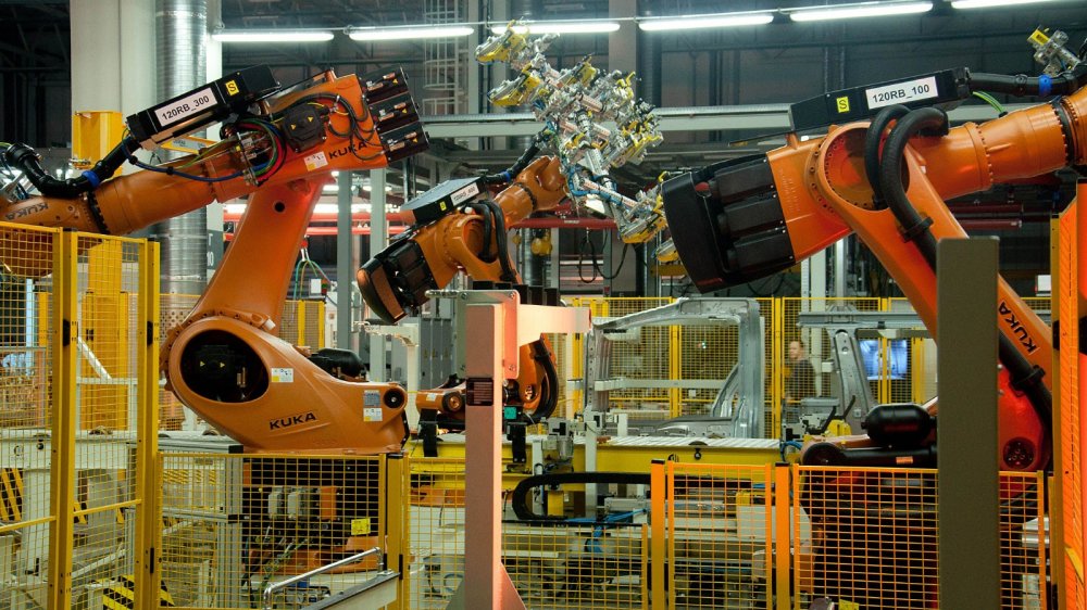 Цех, где варят кабины, называется кузовным (есть ещё цех окраски и логистический). Его архитектуру тут называют “рыбьим хребтом”: есть средняя линия, где идёт основная сборка, а от неё отходят “рёбра” линий подсборки. И на сборке мне показалось, что она вымерла: людей нет, темно… Оказывается, тут почти везде работают роботы. А свет им не нужен.