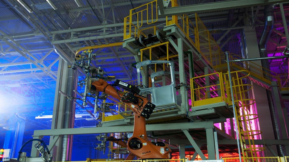 Ещё одна интересная особенность цеха — кабину тут нигде не трогают руками. Крутят эти кабины в ваннах и красят исключительно роботы. Мы же говорили, что их много… Правда, при всём этом герметиком кабину проходят четыре мужика вручную. Говорят, так получается экономически выгодно. Ещё бы!