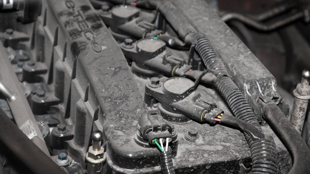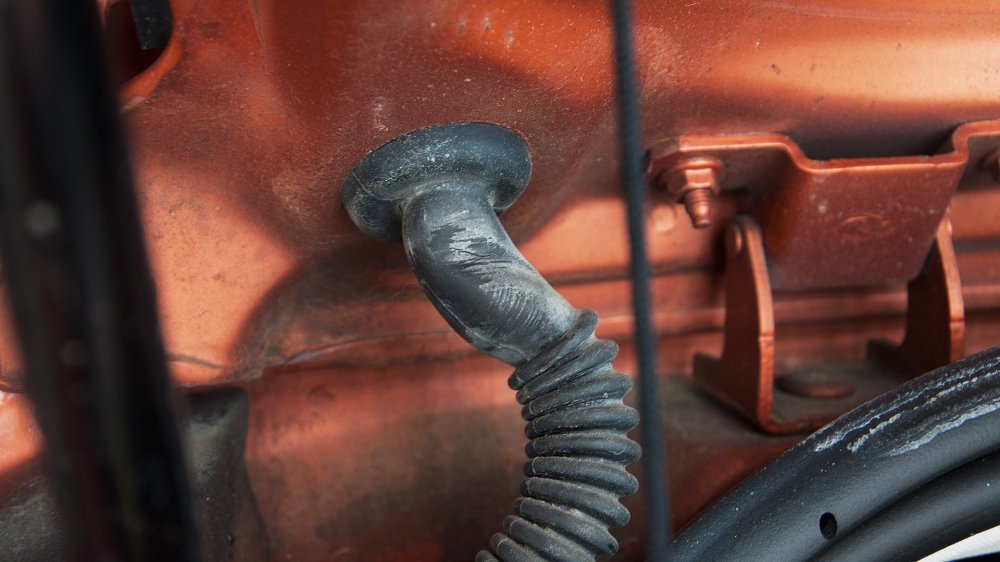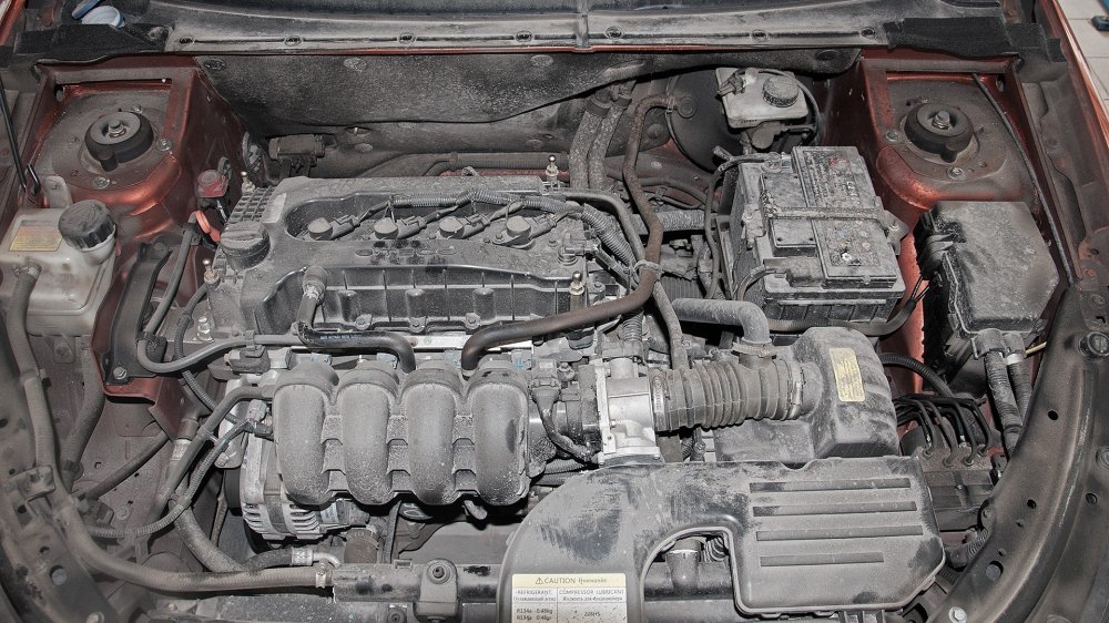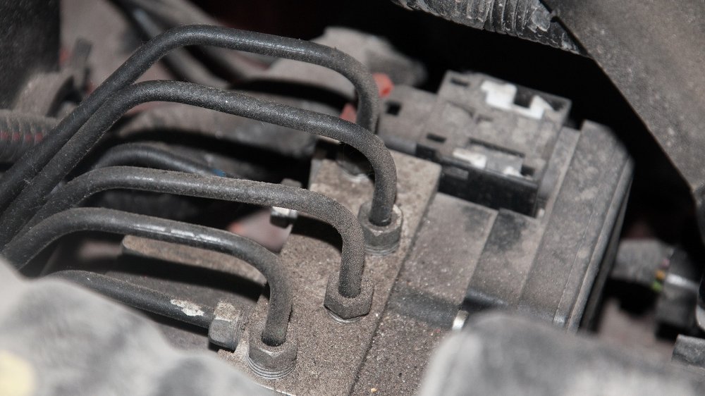 Несмотря на наличие резинового уплотнителя по периметру капота, весь моторный отсек покрыт пылью и грязью. Досталось даже блоку управления АБС, который стоит хоть и сверху, а всё равно весь покрыт слоем дорожной гадости. Видимо, толку от уплотнителя не слишком много.