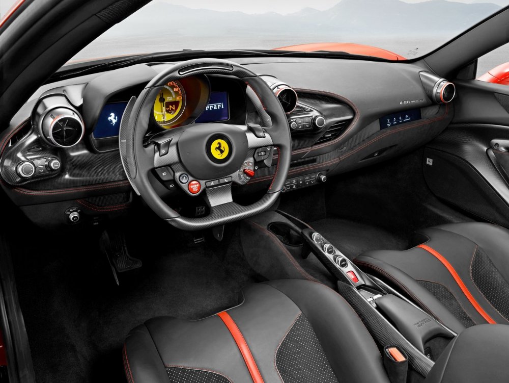 Салон принципиально не изменился, но все элементы новые, в том числе чуть уменьшившееся в диаметре рулевое колесо и круглые дефлекторы системы вентиляции вместо треугольных. Перед единственным пассажиром зачем-то установили индивидуальный 7-дюймовый сенсорный дисплей – ясно, что при активной езде пользовать им будет проблематично. Водителю нарезать повороты поможет фирменная система контроля управляемости Side Slip Angle Control новейшей версии 6.1 и система Ferrari Dynamic Enhancer (FDE+), регулирующая тормозное усилие индивидуально на каждом колесе.
