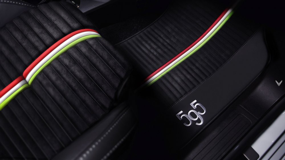 Кстати, коврики тоже являются произведениями искусства сами по себе – гофрированная алькантара, ассиметрично широкие участки кожи с наружной стороны и вышитая цифра 595, все это выполнено с чрезвычайной точностью. И, конечно, снова итальянский триколор, сделанный с помощью кожи. Аналогичным образом оформлены дверные панели и на них тоже присутствует итальянский флаг, правда, в несколько иной форме.