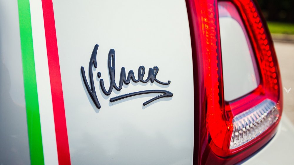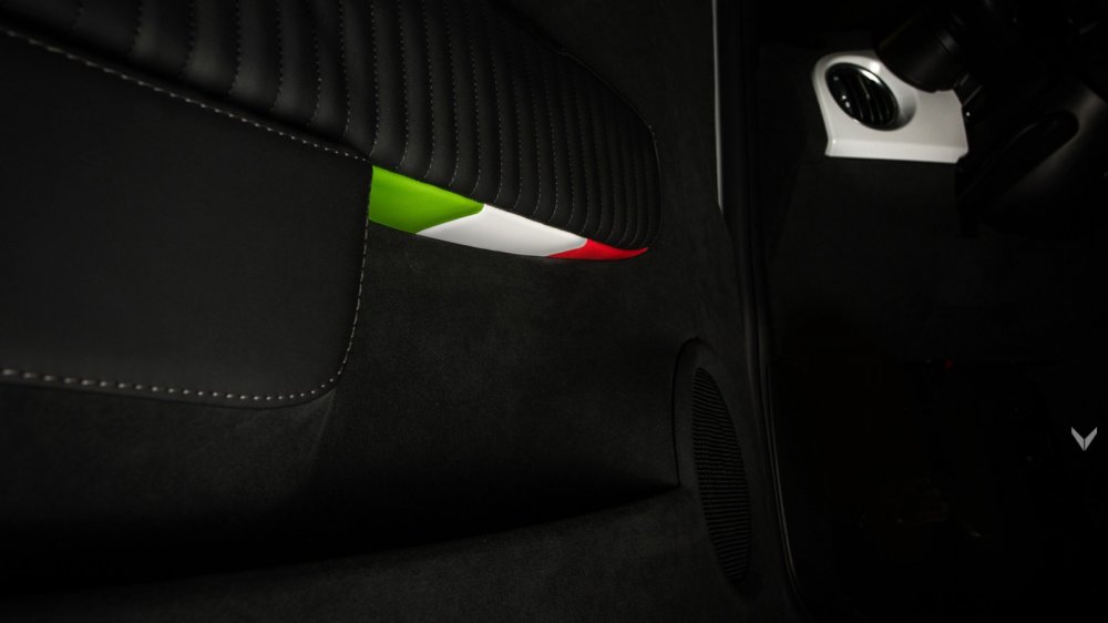 Все начинается с итальянского триколора снаружи. Он выполнен в форме продольной полосы, расположенной ассиметрично с левой стороны автомобиля. Команда Vilner отзеркалила трехцветную полоску внутри – проекция флага покрывает переднюю панель белого цвета Ghiaccio и ниспадает до самого коврика с левой стороны.