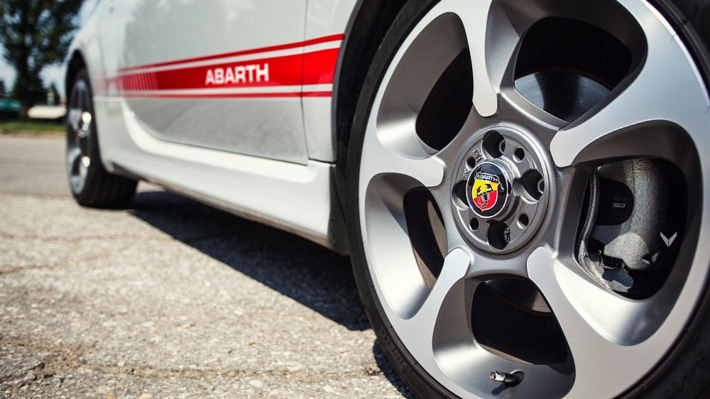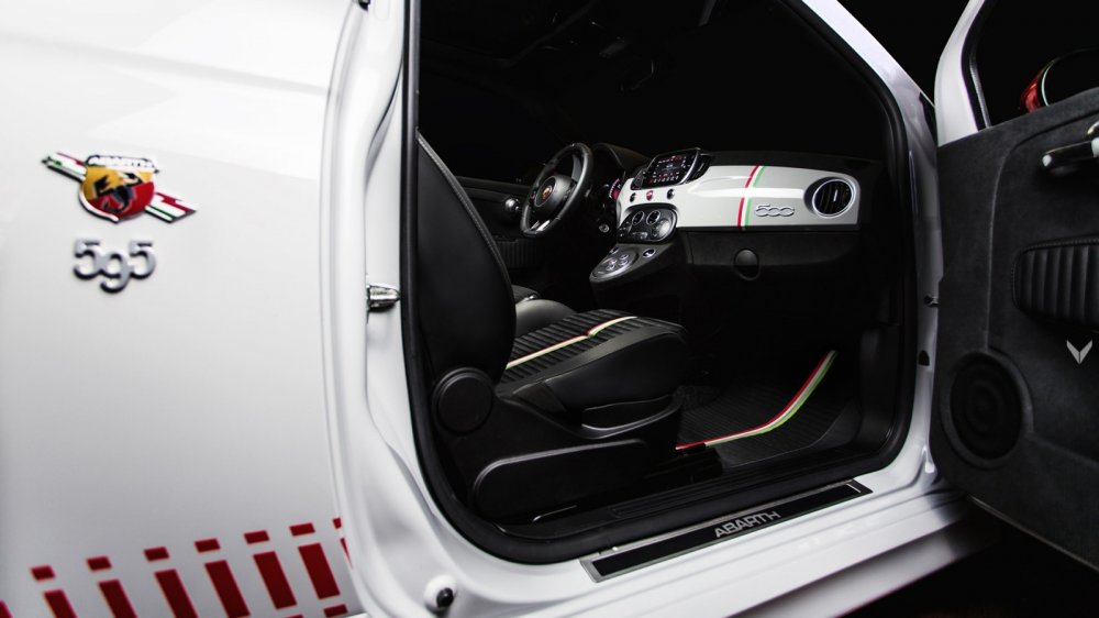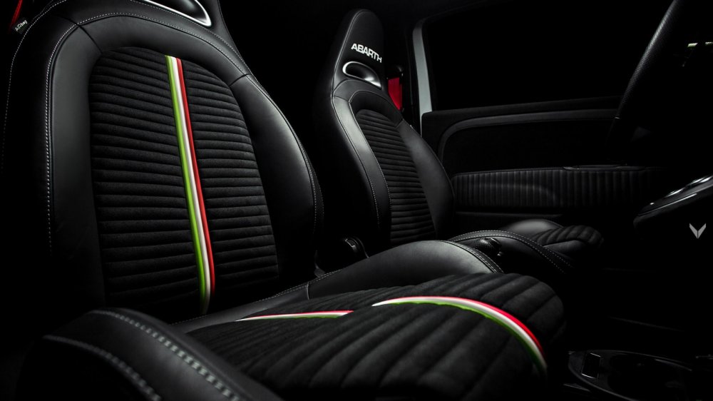 Помимо полосы итальянского флага, кузов автомобиля получил еще несколько дополнительных «оспортивливающих» элементов – графика на дверях, полоса с надписью Abarth в верхней части лобового стекла, а на задний спойлер нанесена текстура красно-белого клетчатого флага. Последний элемент отлично сочетается с опциональной выпускной системой Record Monza Abarth.