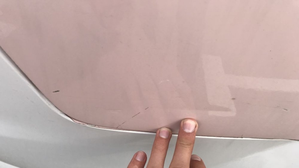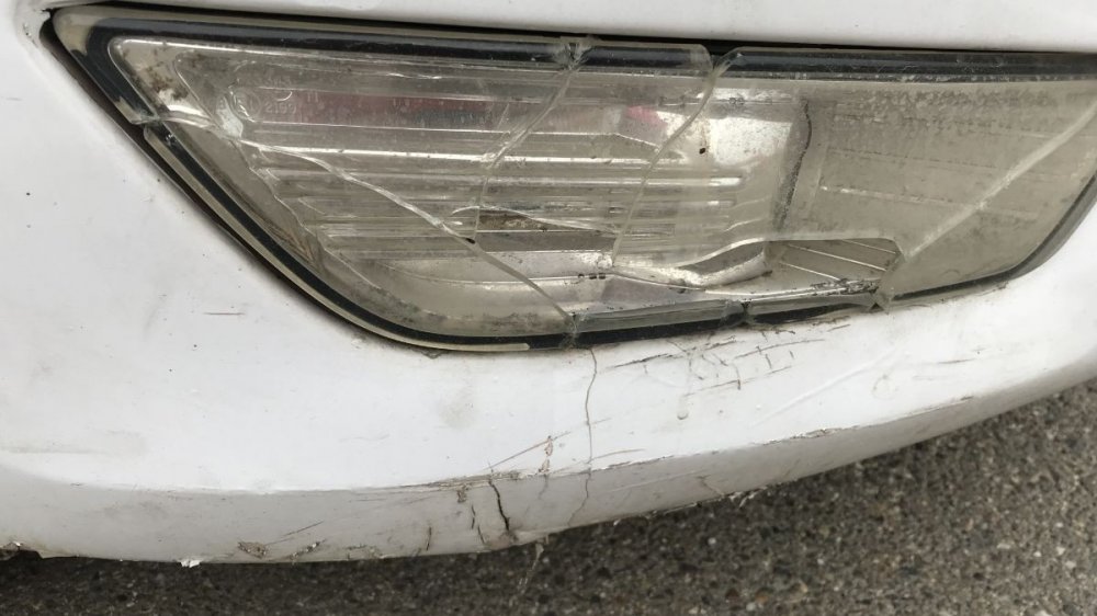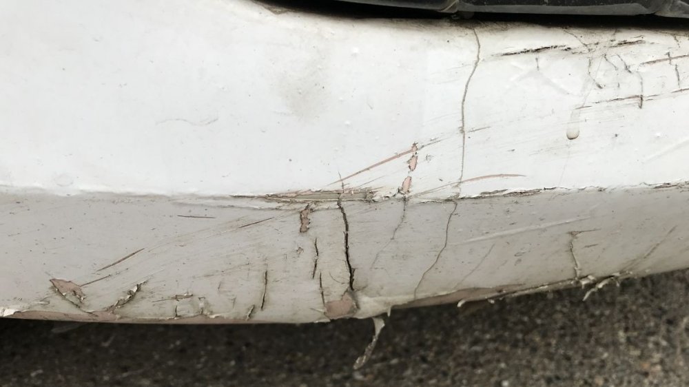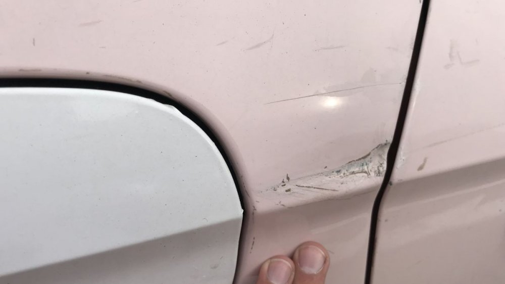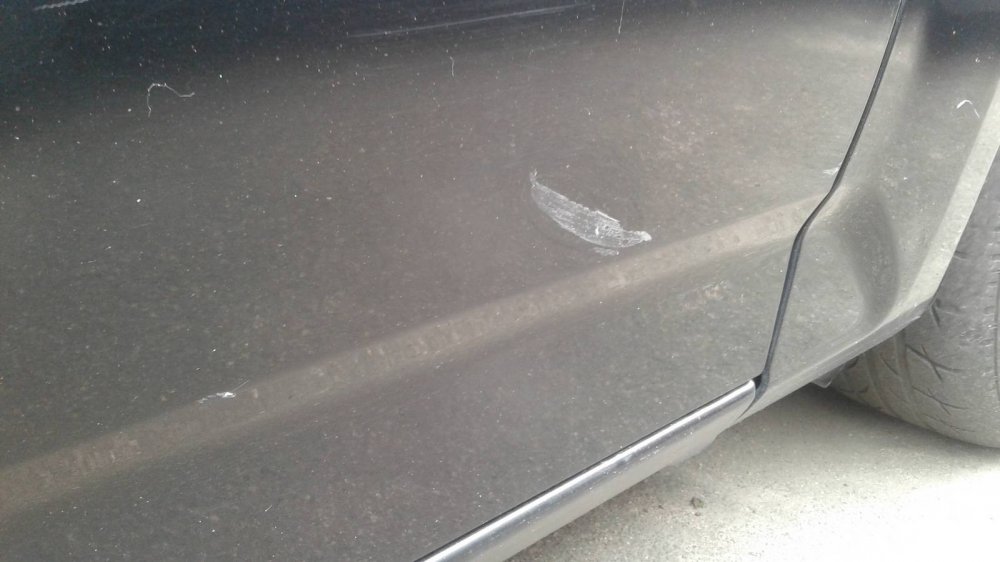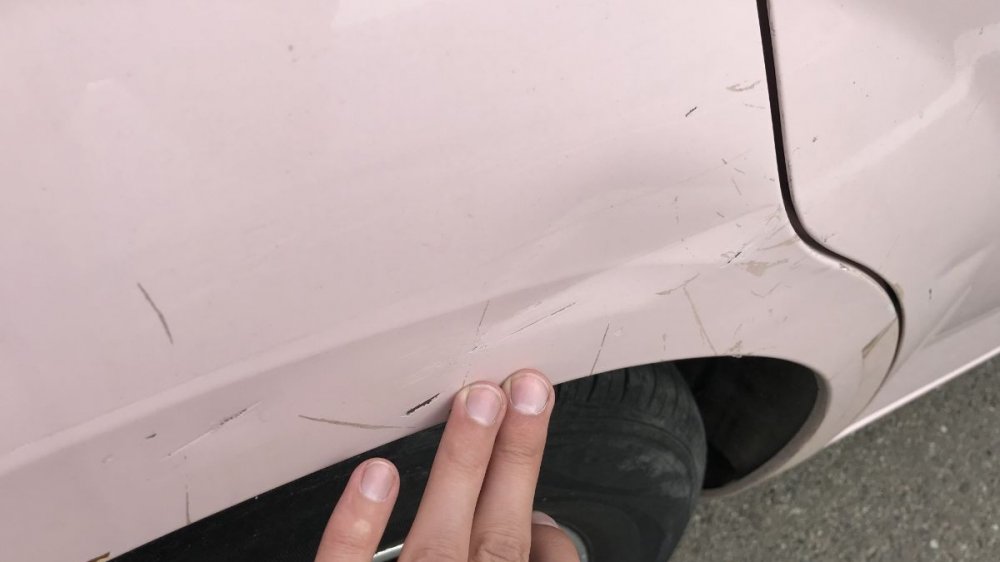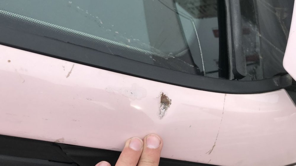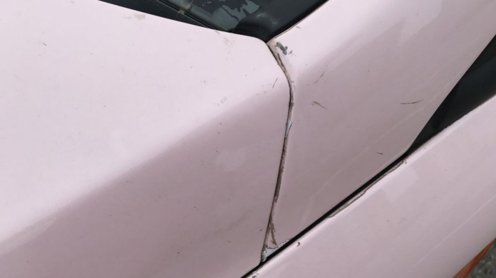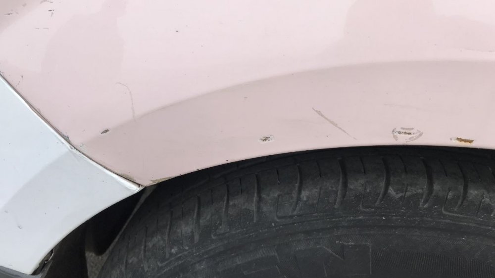 Да, у машины всего один окрас (переднее правое крыло). Зато состояние остальных элементов оставляет желать лучшего – многочисленные вмятины и царапины с очагами коррозии. Лобовое стекло треснуло. Бамперы и лючок бензобака обклеены – видны остатки пленки, которой стыдливо скрывали «девчачий» окрас.