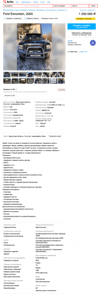 Тем не менее, кое-какие продажи Ford собрал: в первый полный год было реализовано более 50 тысяч машин, хотя потом цифры последовательно пошли на спад от 35 тысяч в 2001 году до 16 в 2005. В Россию Excursion даже ввозились официально – конечно, на серьезные объемы никто не рассчитывал, но и упускать рынок богатых любителей всего самого-самого тоже было бы странно. Собственно, здесь мы подходим к еще одной особенности выбора Excursion: поиске как можно большего объема информации о прошлом конкретного автомобиля.