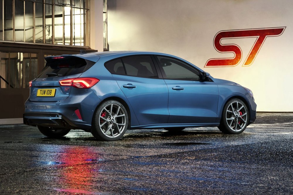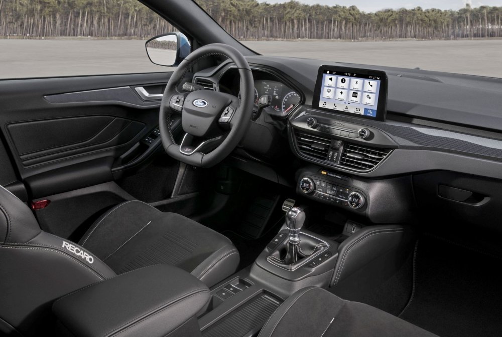 Время разгона до 100 км/ч? Увы, Ford не даёт точного значения, ограничившись застенчивой фразой «менее 6 с». Заметим, что Renault Megane R.S. (280 л.с.) набирает первую «сотню» за 5,8 с, а 300-сильная версия Trophy за 5,7 с, Volkswagen Golf GTI TCR (265 л.с.) – за 5,6 с, Hyundai i30 N (275 л.с.) – за 6,1 с, Honda Civic Type R (320 л.с.) – за 5,7 с. Вряд ли Focus ST станет лучшим в столь плотной группе переднеприводных конкурентов без роботизированной коробки, но удовольствие от вождения обещает быть на уровне. По сравнению с «гражданскими» Фокусами ходовая часть ST отличается более жёсткими пружинами, оригинальными поворотными кулаками, уменьшенным на 10 мм дорожным просветом, более «острым» рулевым управлением и мощными тормозами (диаметр передних дисков – 330 мм, задних – 303 мм). В комплекте с бензиновой версией идёт также самоблокирующийся дифференциал с электронным управлением от Borg Warner и адаптивные амортизаторы. Ездовая электроника имеет три предустановленных режима – Normal, Sport и Slippery/Wet (для езды по скользкому и влажному дорожному покрытию). Пакет Performance Pack предусматривает также более тонкие индивидуальные настройки для заездов по гоночному треку.