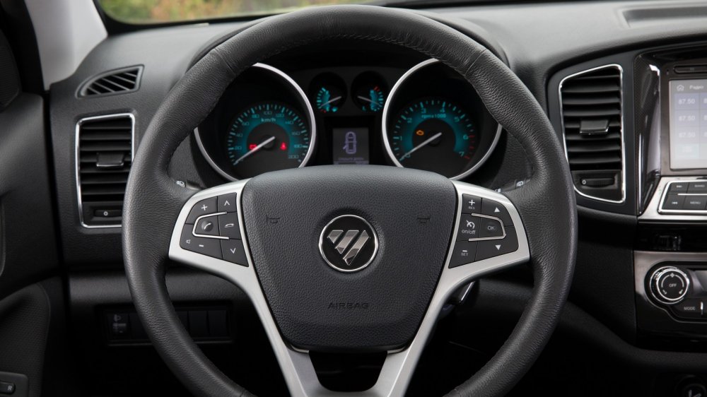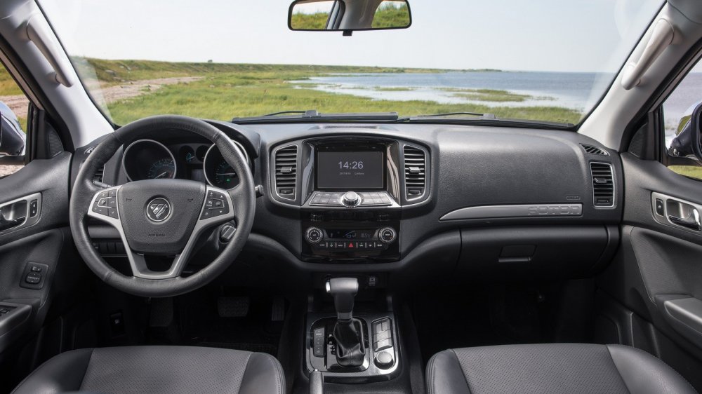 Что же касается интерьера, то выглядит он вполне современно. Пластик передней панели – жесткий софт-лук, но ставшего притчей во языцех фенольного «запаха китайского автомобиля» я не ощутил. Руль – пухлый, ухватистый, с приятным сечением. И очень хорошо, что китайские конструкторы не переборщили с «эргономическими наплывами». Хотя я предпочитаю обходиться вообще без них, но те, что есть на руле Foton Sauvana, мне совершенно не мешали. И на водительском месте я устроился без каких-либо проблем, несмотря на то, что рулевая колонка регулируется только по углу наклона. Диапазона как вертикального, так и продольного перемещения сиденья хватило с избытком, при этом и «сам за собой» я сел безо всяких проблем.