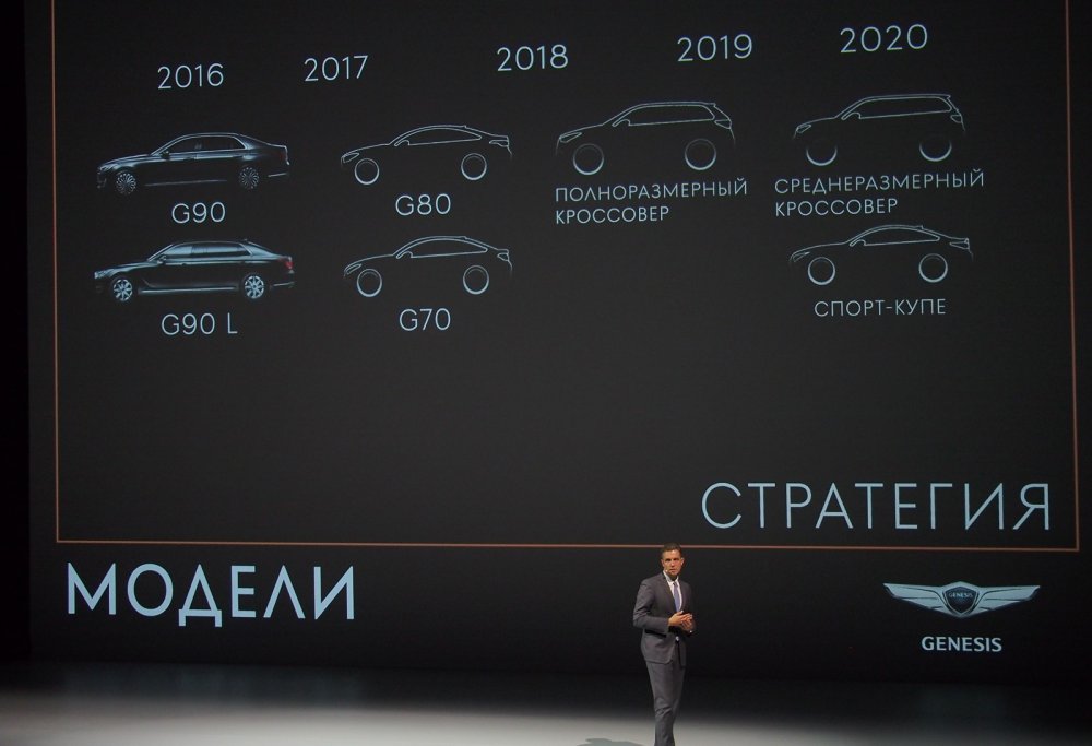 Согласно презентации, Genesis планирует с течение пяти лет (с 2016 по 2020 включительно) запустить продажи семи моделей. Одна из них – флагманский представительский седан G90 – была представлена в рамках недавнего мероприятия. «Это рычаг, который будет тянуть вверх весь концерн Hyundai Motors», — сказал об автомобиле вице-президент Манфред Фитцджеральд.
