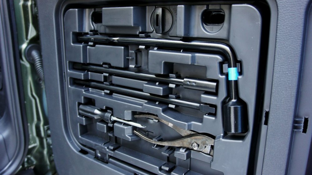 В багажнике помимо мощных ушек-креплений для растяжки груза имеется розетка на 220 вольт/150 ватт, что удобно для зарядки ноутбука, к примеру. В небольшой узкой нише под полом багажника размещены два пластиковых лотка. В одном живет винтовой бутылочный домкрат, второй можно использовать под тряпки-губки-скребки. В двух нишах в задней двери хранится набор инструментов – знак аварийной остановки, баллонник, удлинители домкрата, отвертка и раздвижные пассатижи. Все зафиксировано очень надежно и прижато крышками с мягким уплотнителем, так что инструменты не издают бряков даже на суровых колдобинах.