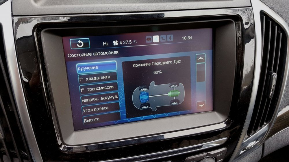 В полноприводных режимах многочисленные датчики отслеживают пробуксовки на скользких поверхностях и резкие ускорения, момент на валу двигателя, скорость, передачу и угол поворота руля, и, опираясь на эти данные, «мокрая» многодисковая электронная муфта в раздаточной коробке от BorgWarner перебрасывает часть крутящего момента на переднюю ось (вплоть до соотношения 50:50). Это соотношение можно видеть на мониторе (то самое меню «кручение»). Правда, «арифметика» там не слишком очевидная: 60% (как на фото ниже), 70% и любое иное количество процентов – это проценты не от общего крутящего момента, производимого двигателем, а от максимально доступной для переднего моста половины.