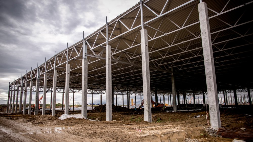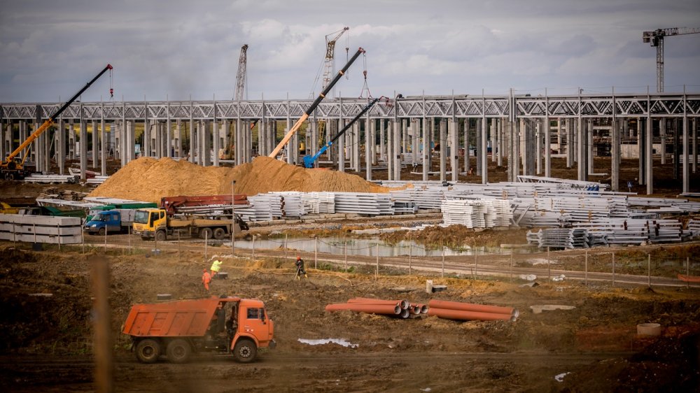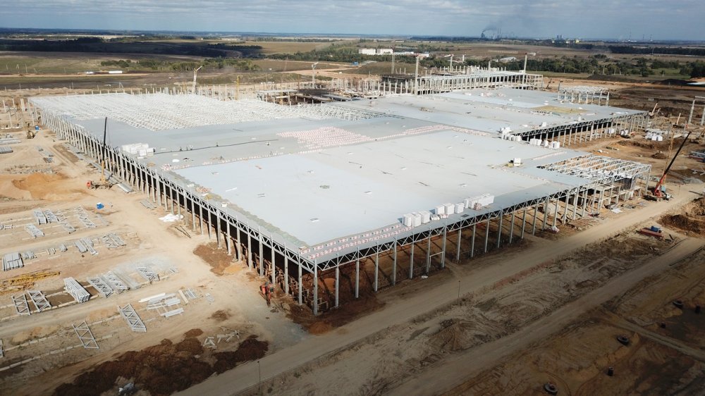 Работники возводят внутренние и наружные стены зданий, проводят работы по перекрытию кровли будущих цехов нового автомобильного завода, подводят коммуникации, ведут строительство дорожной сети. Известно, что в следующем месяце должна быть осуществлена первая поставка производственного оборудования для предприятия.