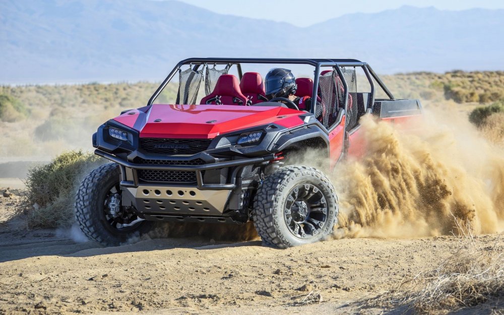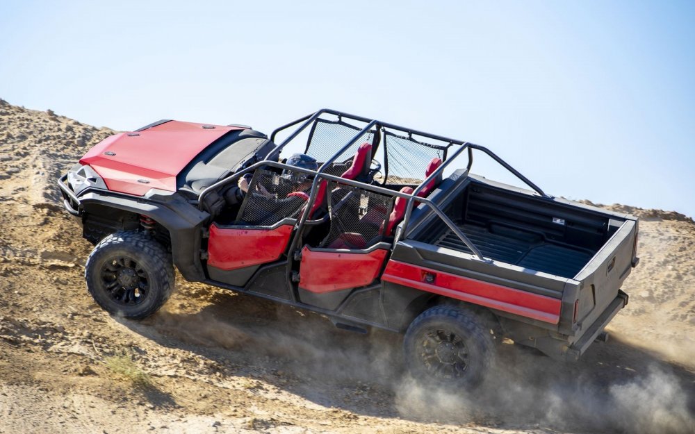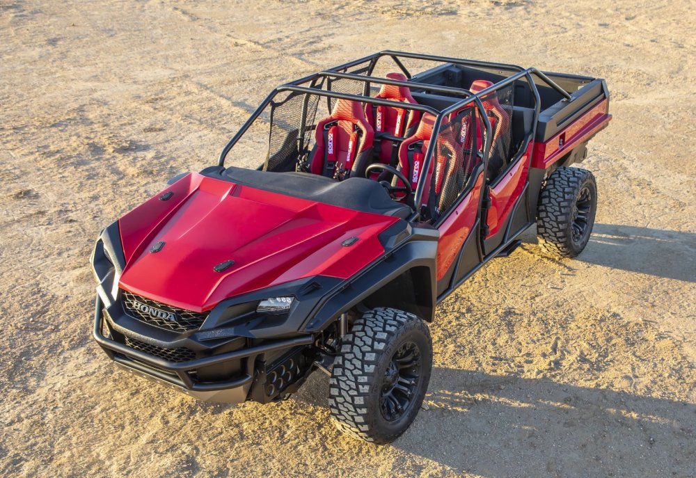 В салоне – четыре индивидуальных кресла с развитой боковой поддержкой от хот-хэтча Honda Civic Type R. Панель приборов – такая же, как у пикапа, но упрощённая до мотовездеходного минимума, то есть без отделки, «лишних» кнопок и дефлекторов системы вентиляции (на месте центральных воздуховодов – два держателя для смартфонов). Руль напрямую взят у квадроцикла Pioneer 1000.