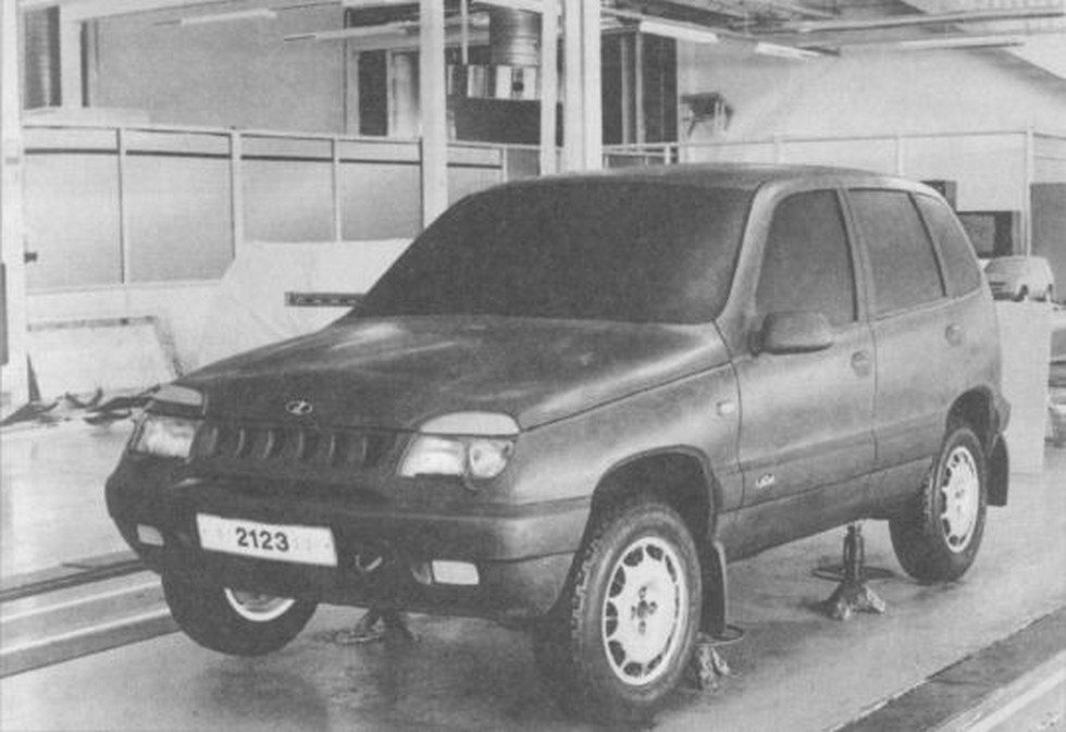 Концепция Нивы второго поколения окончательно сформировалась в 1987 году: было утверждено, что проходимость должна остаться примерно на уровне ВАЗ-2121, но комфорт при этом — повыситься, и в частности поэтому база автомобиля должна увеличиться на 150 мм. К тому моменту у дизайнера А. Белякова уже были эскизы и даже первые масштабные макеты новой Нивы. В том же 1987 году появляется компоновка будущего автомобиля, и 1988 год уходит у Белякова на «привязывание» дизайна к проектируемым узлам и агрегатам. Кроме того, летом 1988 года макет модели 2123 в масштабе 1:4 продувается в аэродинамической трубе КАИ и показывает коэффициент лобового сопротивления Cx на довольно высоком уровне – 0,36. Предположительно это вдохновило Белякова сделать машину ещё более стремительной, и на полномасштабном пластилиновом макете он вводит аэродинамичные рейлинги, переходящие в спойлер на законцовке крыши.
