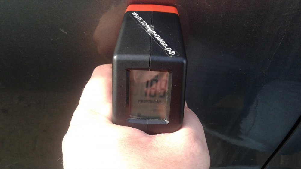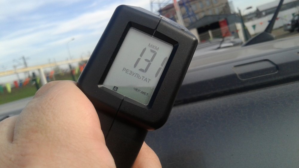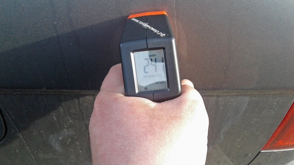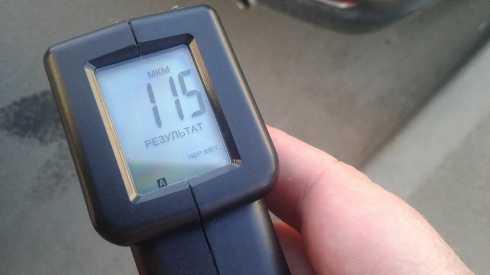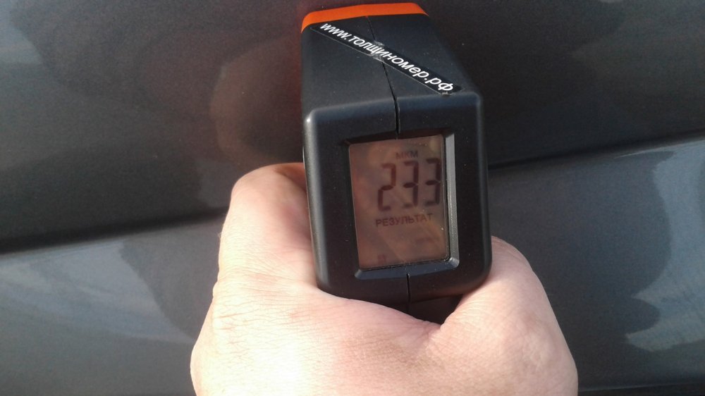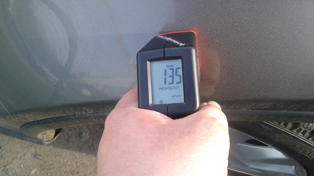 Давайте на всякий случай проверим ЛКП толщиномером. А вот тут всё хорошо — слой ровный, ни двойной окраски, ни тем более шпатлёвки найти не удалось.