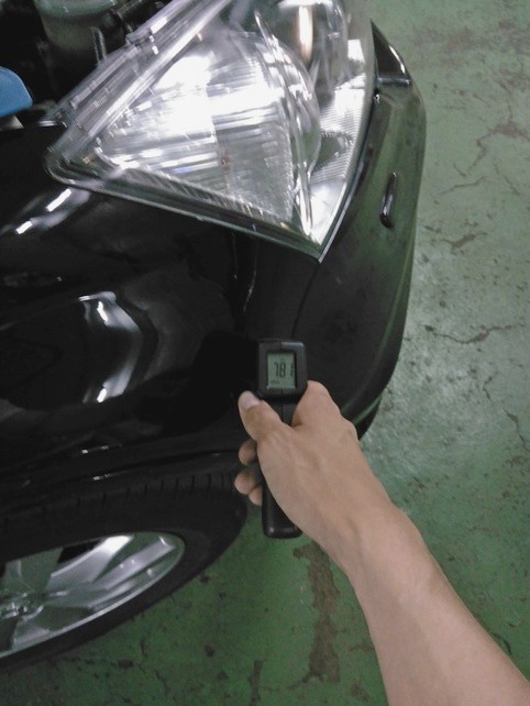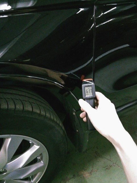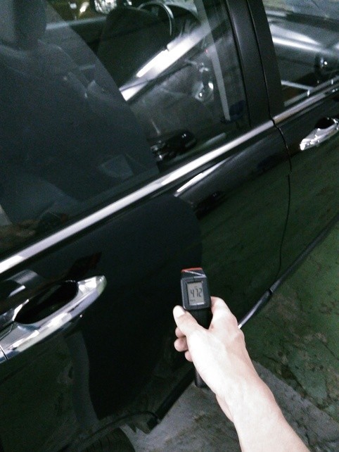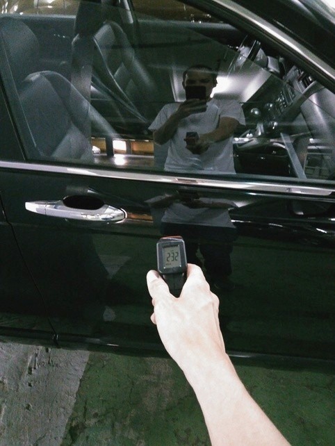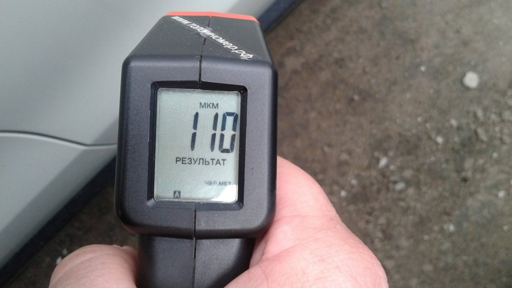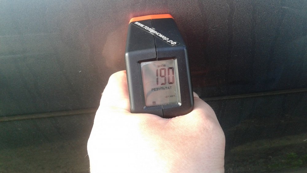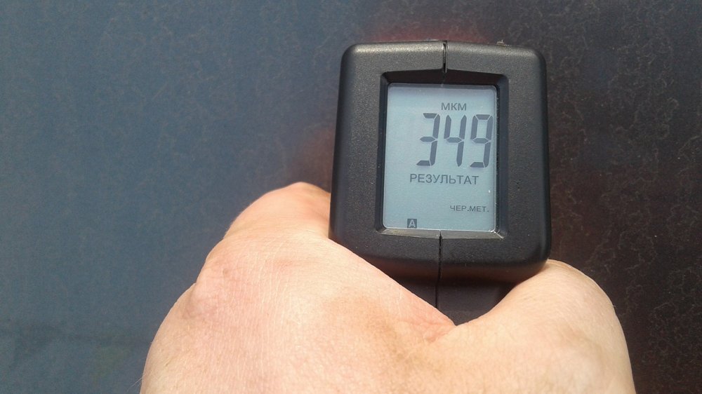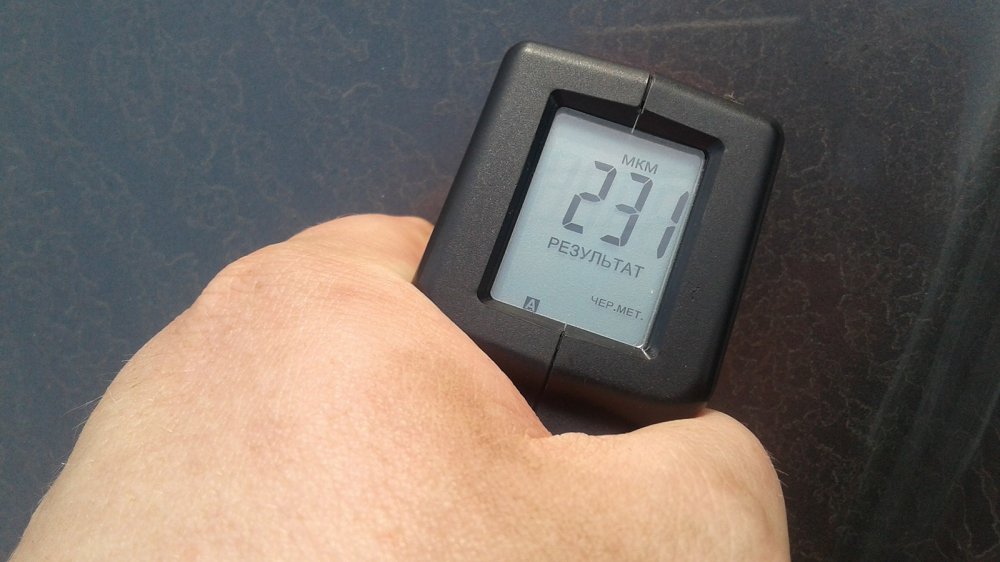 Давайте на всякий случай проверим ЛКП толщиномером. А вот тут всё хорошо — слой ровный, ни двойной окраски, ни тем более шпатлёвки найти не удалось.