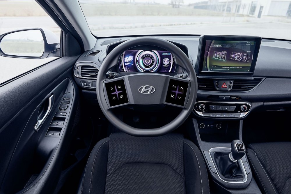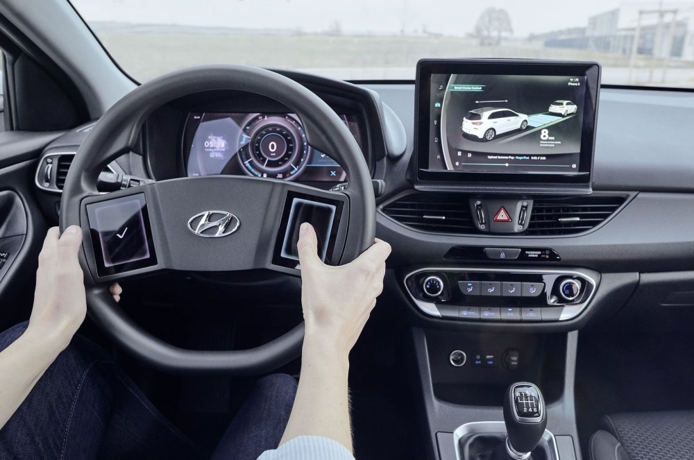 Новая концепция интерьера разрабатывается европейским подразделением Hyundai с 2015 года, перед инженерами стоит полная противоречий задача: интегрировать в автомобиль современные цифровые сервисы и при этом снизить информационную нагрузку на водителя, сделать так, чтобы он меньше отвлекался от дороги. Разработчики решили, что будет правильно, если руки водителя будут всё время находиться на руле, и сначала снабдили спицы мультифункциональными сенсорными панелями, наподобие тех, что сейчас применяет Mercedes-Benz, но затем эти сенсоры трансформировались в большие настраиваемые тач-скрины с тактильной обратной связью. Из-за большой площади этих экранов руль тестового прототипа напоминает «баранку» старого Opel Kadett, но для серийных машин дизайнеры наверняка придумают какое-нибудь более изящное решение. На рулевые сенсорные экраны можно выводить любые иконки, а их расположение подгонять под пальцы конкретного водителя и сохранять в памяти. Крупный размер иконок должен снизить время визуального контроля.