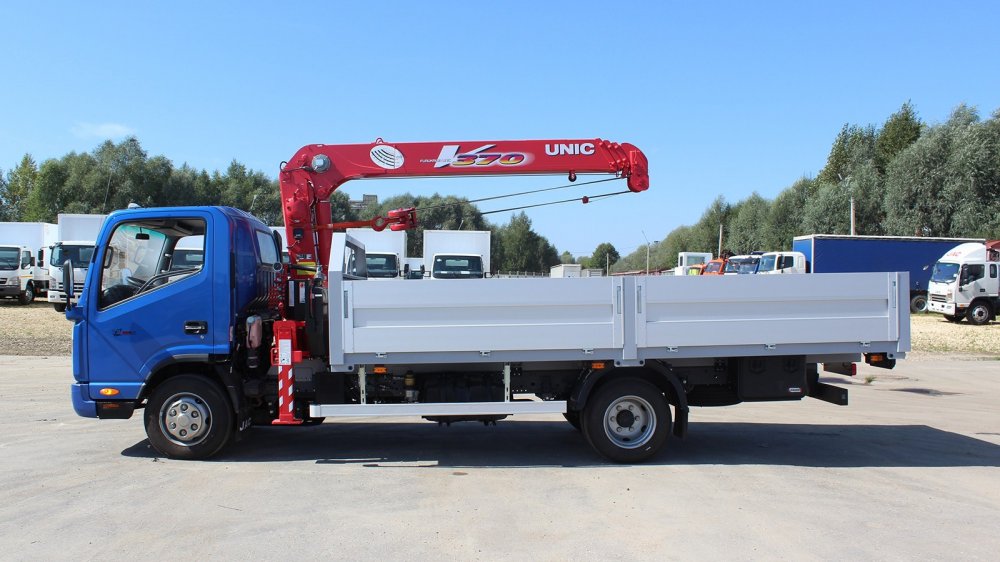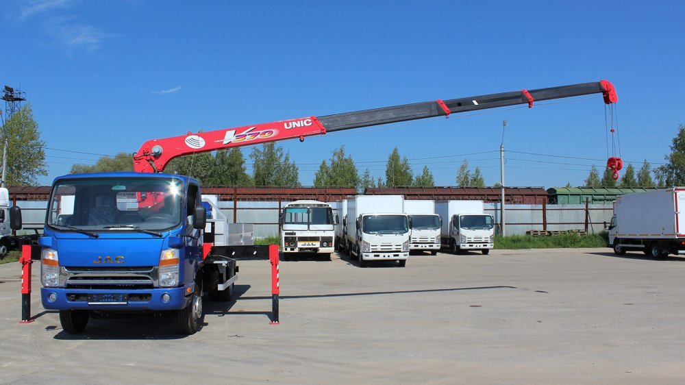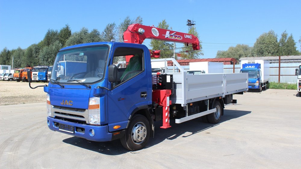 Грузовая платформа с краном-манипулятором Unic-374 реализована на базе шасси JAC N-75. Борта изготовлены из алюминиевого профиля, имеют откидные боковые секции и съёмные стальные промежуточные стойки. Замки — оцинкованные, настил выполнен из транспортной фанеры, для крепления груза в полу платформы есть шесть такелажных колец.
