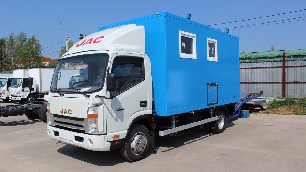 Автомастерская также создана на базе шасси JAC N-75. Фургон имеет два отсека: пассажирский и отдел мастерской. Обшивка снаружи изготовлена из армированного стекловолокном пластика. отделка пассажирского отсека выполнена из ламинированной фанеры, а мастерской — из оцинкованного металла.