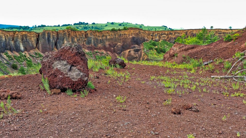 До этого мне довелось видеть только один палеовулкан, а именно Гирвас в Карелии. Но кратер Гирвас — очень старый, практически полностью разрушенный водной эрозией и затопленный протекающей через него речкой Суна. Ракош — другое дело, он действительно выглядит как кратер: есть и гора, и дыра… Особенно если рассматривать снимок из космоса на гугл-картах. Но и на земле кратер оставляет сильное впечатление: абсолютно неземной пейзаж, хрустящая под ногами вулканическая пемза и валяющиеся тут и там лавовые «бомбы».