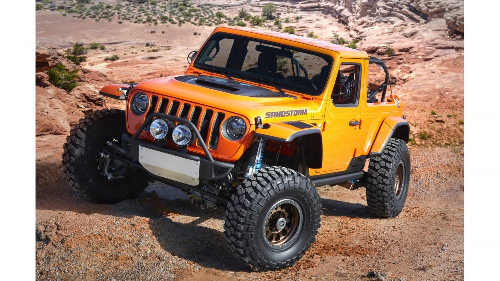 Jeep Sandstorm построен в стилистике гоночных внедорожников. У концепта четырехрычажная длинноходная (356 мм спереди и 457 мм сзади) подвеска, встроенный компрессор, дополнительное освещение, капот из карбонового волокна, каркас безопасности совмещенный со структурой кузова, 17-дюймовые бедлок-колеса, обутые в резину BF Goodrich Krawler размерностью 39,5 дюйма.