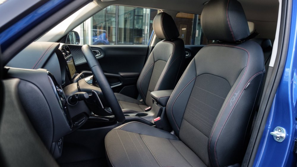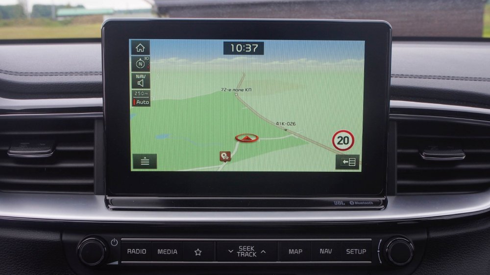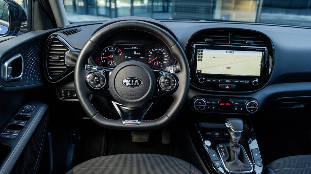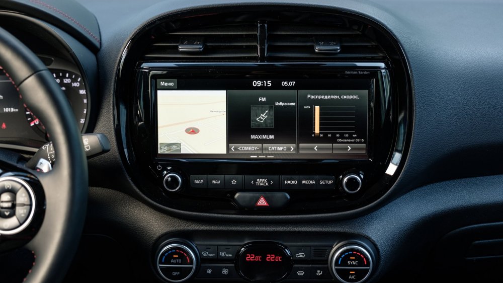 Внутри новый Soul тоже не разочаровывает: кресла с комбинированной обивкой и красной прострочкой, ухватистый D-образный руль, обтянутый исключительно приятной на ощупь кожей «наппа», большой информационный дисплей на приборной панели и главная доминанта: огромный широкоформатный тачскрин с диагональю 10.25” головного устройства медиасистемы, вписанный в овальную окантовку: над экраном — дефлекторы системы вентиляции, под ним — кнопки управления медиасистемой. Посадка — почти вертикальная (а я это люблю), обзорность — отменная…