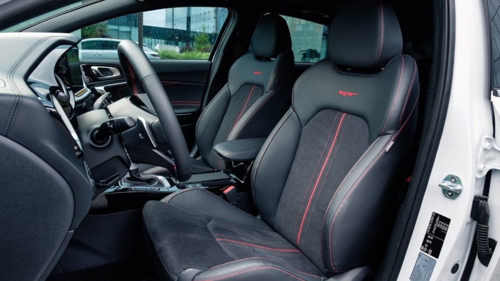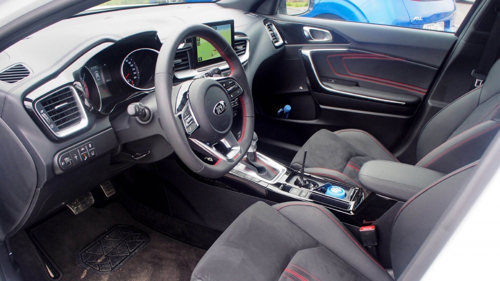 А вот ProCeed GT, с его уменьшенным на 5 мм дорожным просветом, увеличенной жесткостью пружин и стабилизатора поперечной устойчивости и перенастроенными амортизаторами — это совсем другое дело… Ты садишься в кресло с развитыми боковыми валиками и отделкой из черной кожи и искусственной замши, с красной прострочкой и логотипом GT, ставишь ноги на педали с алюминиевыми накладками, кладешь руки на маленький пухлый спортивный руль с усеченным нижним сегментом, обтянутый качественной перфорированной кожей в зоне хвата, и начинаешь проникаться атмосферой азарта.