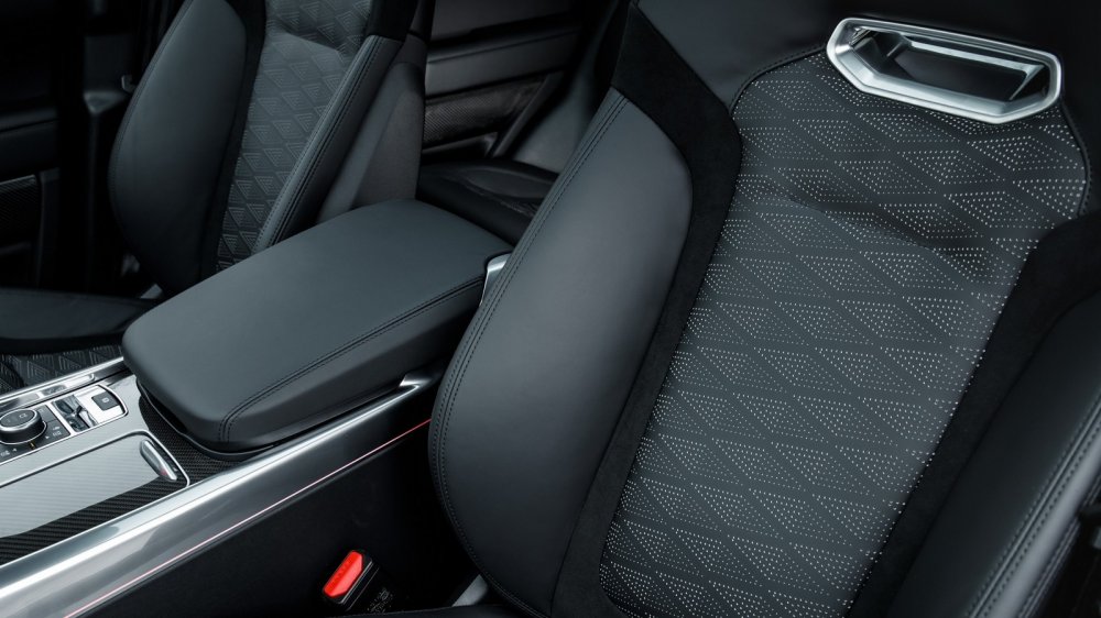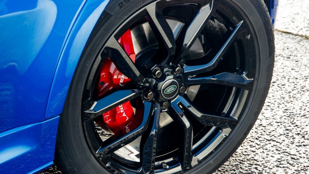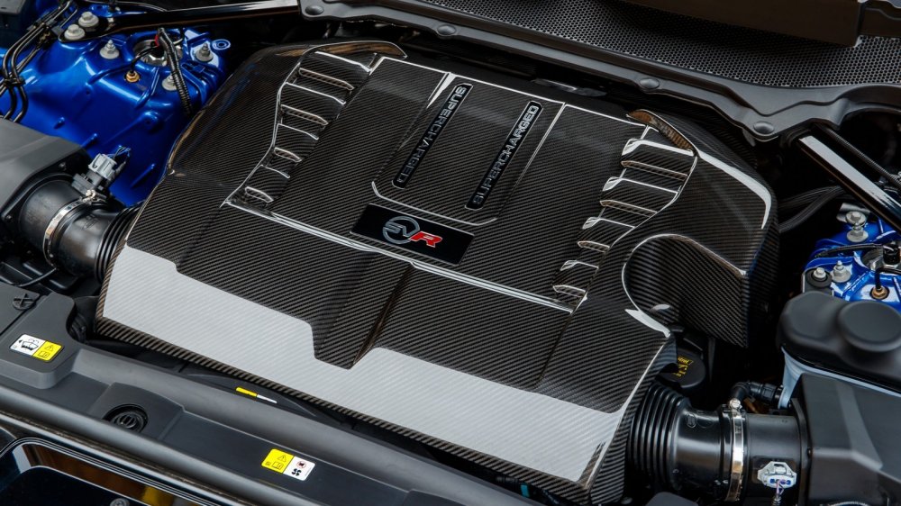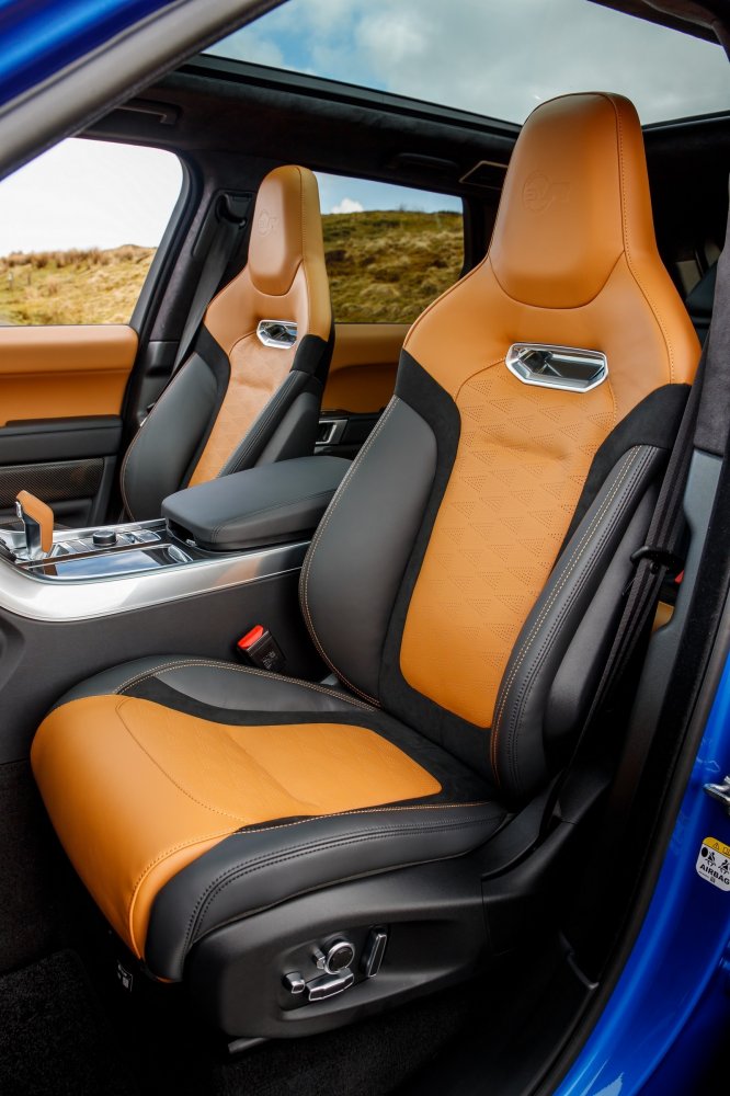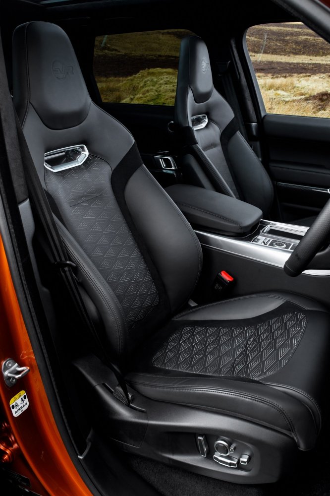 На “обычном” рестайлинговом Спорте поездить не довелось — исключительно на самой-самой версии SVR, подготовленной в ателье Special Vehicle Operations. Максимальная отдача компрессорного V8 здесь — 575 л.с. и 700 Нм. Из интересных новшеств — новые кресла с лёгким каркасом из магниевого сплава и опциональный капот из углепластика. Последний стоит в Англии больше 6 000 фунтов, но обеспечивает не только некоторое снижение веса, но также и лучшую вентиляцию подкапотного пространства за счёт воздухозаборников. Алюминиевый капот, говорят, так не отформовать, и прорези не сделать.