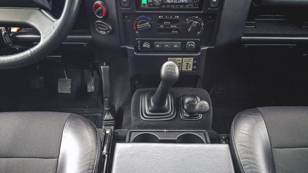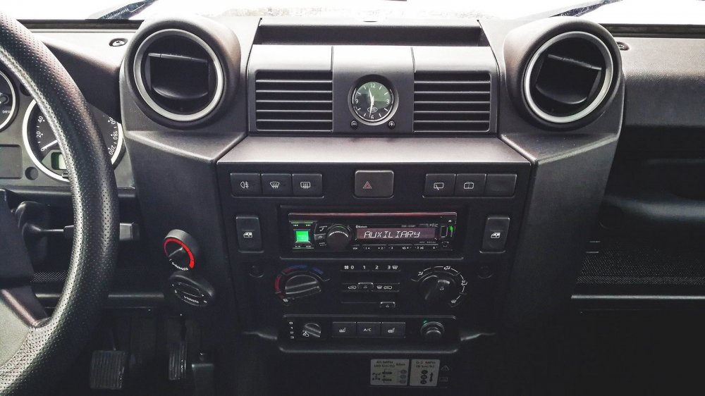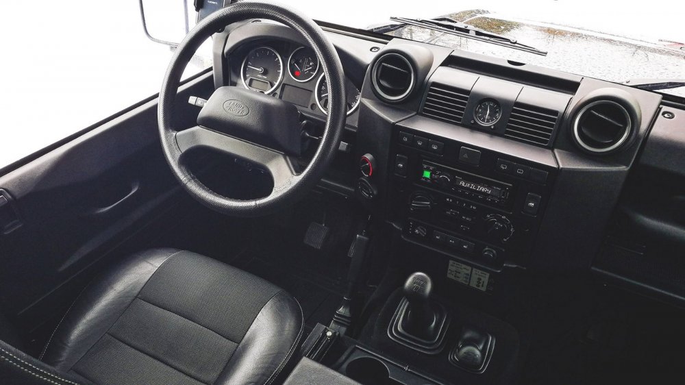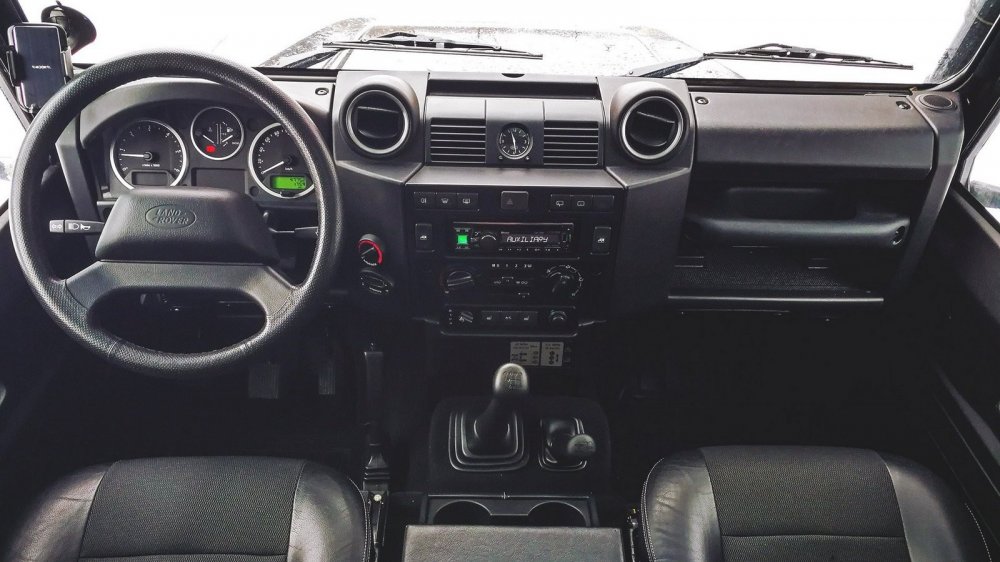 Стрелочные часы в салоне Defender словно остановились — внедорожник 2014 модельного года так и довольствуется интерьером восьмилетней давности. В 2006 году модель пережила значительный рестайлинг. Общий стиль передней панели с круглыми дефлекторами вентиляции от Ford Fiesta схож с Discovery 3, но качество пластика, ширина зазоров и обитый дерматином фанерный ящик, называемый боксом-подлокотником, не оставляют сомнений в утилитарном предназначении машины. Комплектация соответствующая: передние электрические стеклоподъемники, кондиционер, обогрев сидений и лобового стекла. С такой внешностью глупо было ждать другого.