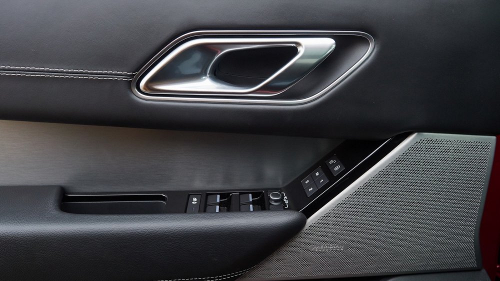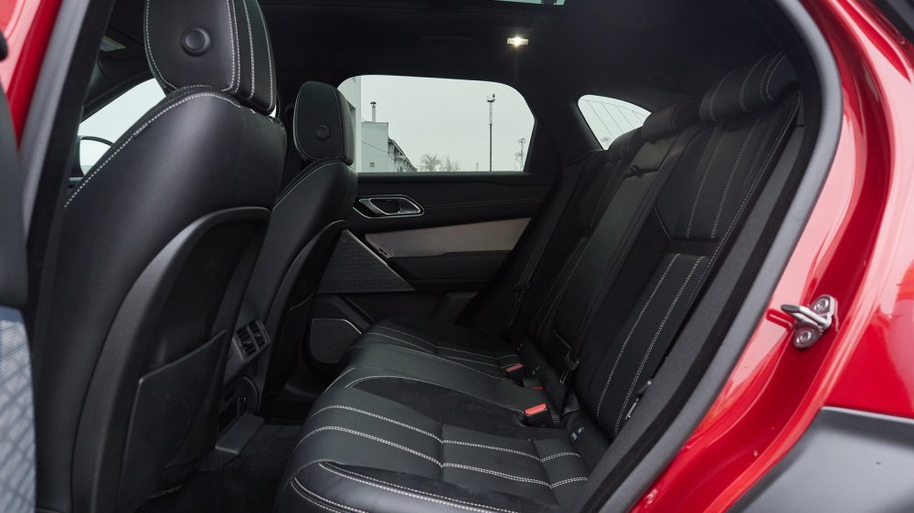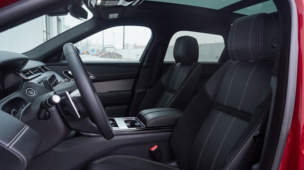 Или вот взять кресла. С одной стороны — все отлично: хороший профиль, прекрасная мягкая кожа (при этом внутренняя часть валиков боковой поддержки сделаны из нескользящей замши, и это действительно очень удачное решение), и развитая боковая поддержка присутствует. Но после пары часов за рулем я почувствовал, что мне хочется чуть-чуть увеличить поясничный подпор. Полез искать клавишу его регулировки — а ее и нет, и регулировки такой нет. То есть, она теоретически есть, но только в более высокой комплектации HSE, которая примерно с тем же набором опций обошлась бы почти не в 6 200 000, а в 6 900 000. И получается странно: на моем скромном Freelander 2 SE, причем дизельном и не в самой дорогой комплектации, регулировка поясничного подпора есть, а в дорогущем Velar c самым мощным мотором и претензией на спортивность — нет. Роскошная панорамная крыша с огромным люком — есть, отличная медиасистема Meridian с богатым, глубоким и качественным звучанием — есть, а вот регулировки поясничного подпора — нет!