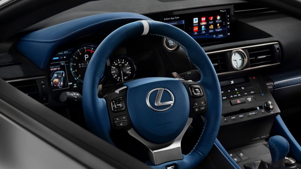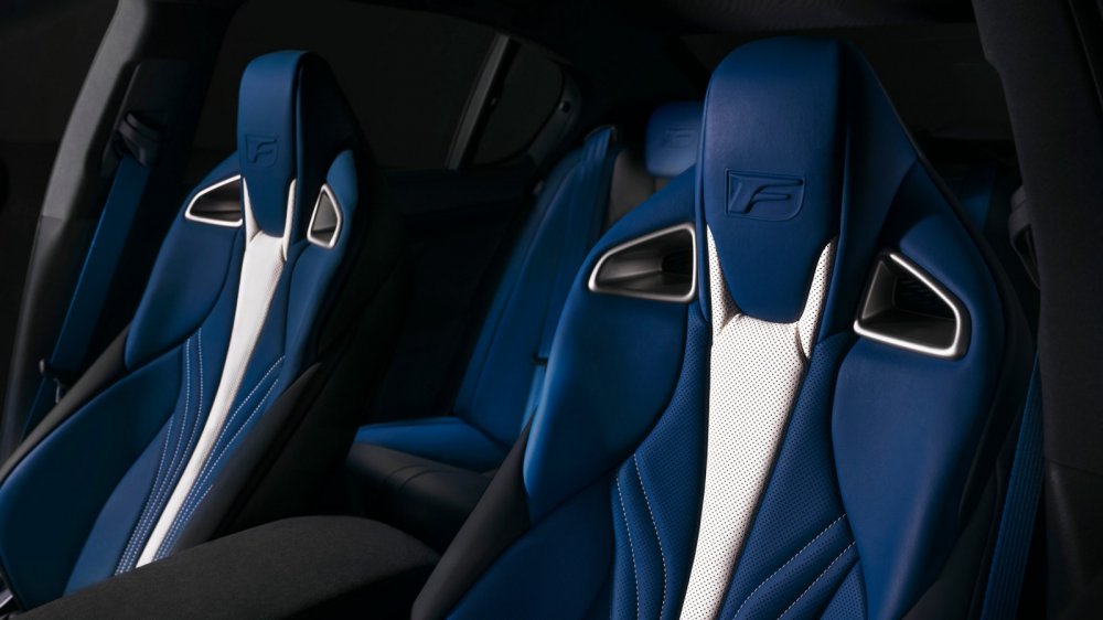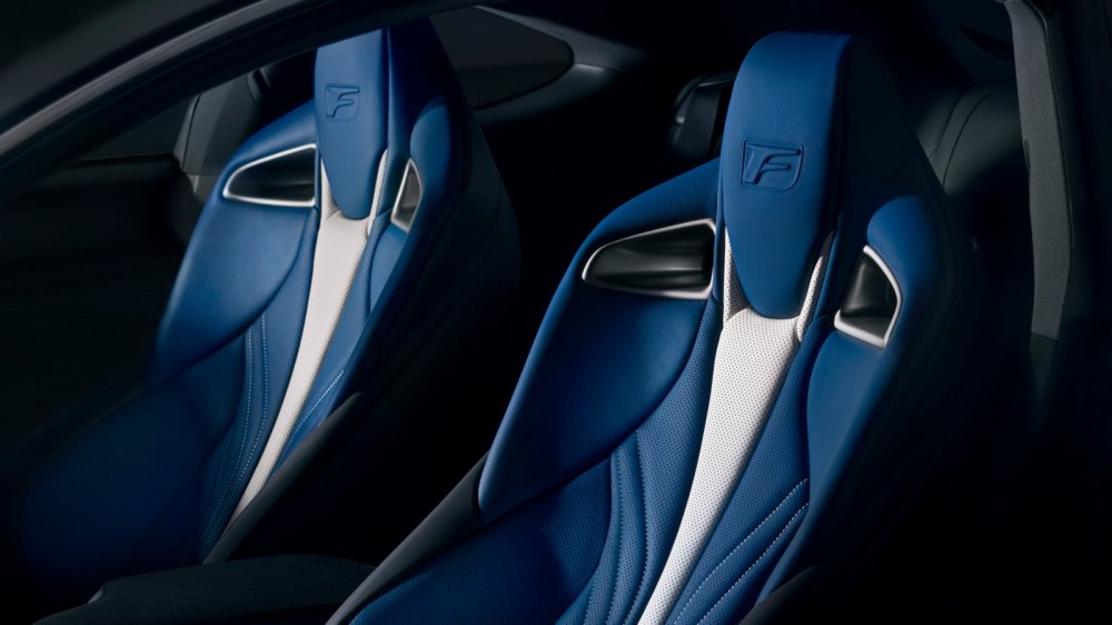 В купе RC F передние кресла обтянуты голубой кожей. В аналогичном стиле оформлен рычаг передач, рулевое колесо и козырек «приборки», а обивка потолка выполнена с тиснением. У седана GS F, помимо передних, обивку из голубой кожи получили боковины задних сидений, центральную консоль отделали голубым карбоном в сочетании с голубой замшей и голубыми ремнями безопасности. Голубая кожаная отделка присутствует также на руле, консоли и рычаге передач, но обивка потолка уже выполнена без тиснения как у RC F.