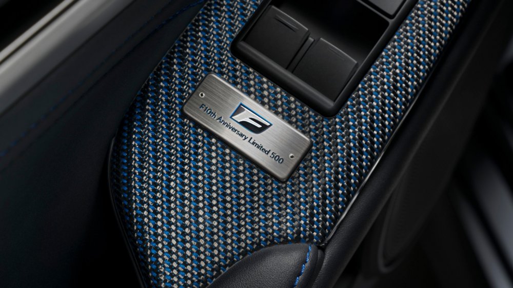 Внутри выполнена уникальная голубая карбоновая отделка в сочетании с кожаными вставками аналогичного оттенка. Табличка с гравировкой подчеркивает эксклюзивность автомобиля. Всего в честь десятилетнего юбилея Lexus F будет построено 240 единиц RC F, что отвечает количеству дилеров марки в США, тогда как тираж GS F составит 100 единиц.