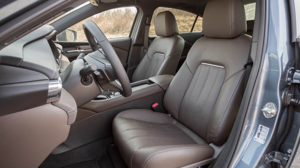 Полностью оставить в стороне интерьерные дела было бы неразумно, ведь японцы предложили теперь и новые сиденья весьма оригинальной идеологии. Конструкция их создана таким образом, что при неподвижной тазовой части тела водителя, спинка вовсе не плотно облегает верхнюю часть туловища, допуская колебания. Расчёт был таков: имитировать при колебаниях кузова колебания верхней части тела так, чтобы создать у водителя привычные ощущения при ходьбе. Ещё одна цель — избавить водителя от всех вибраций и нагрузок, передающихся на кузов машины от дороги при переезде любых препятствий с любым профилем дороги.