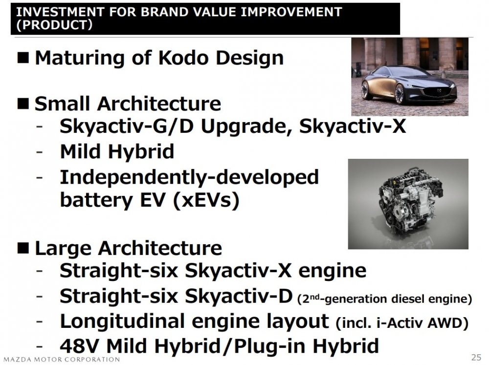 В своем годовом финансовом отчёте, опубликованном на прошлой неделе, Mazda подтвердила верность курсу на премиум-сегмент и раскрыла некоторые любопытные детали ближайших эволюций модельного ряда: в нём появятся автомобили с продольно расположенными 6-цилиндровыми двигателями и опциональной системой полного привода i-Activ AWD. Судя по слайду на странице 24 из презентации, стоить такие автомобили будут примерно в два раза больше по сравнению с нынешними автомобилями Mazda, то есть речь идёт о полноценных конкурентах Audi, BMW, Mercedes-Benz и Jaguar. Разрабатываемое семейство рядных «шестёрок» включает в себя как турбодизели Skyactiv-D второго поколения, так и бензиновые агрегаты Skyactiv-Х, у которых воспламенение частично происходит от сжатия, что даёт им поистине дизельную экономичность.