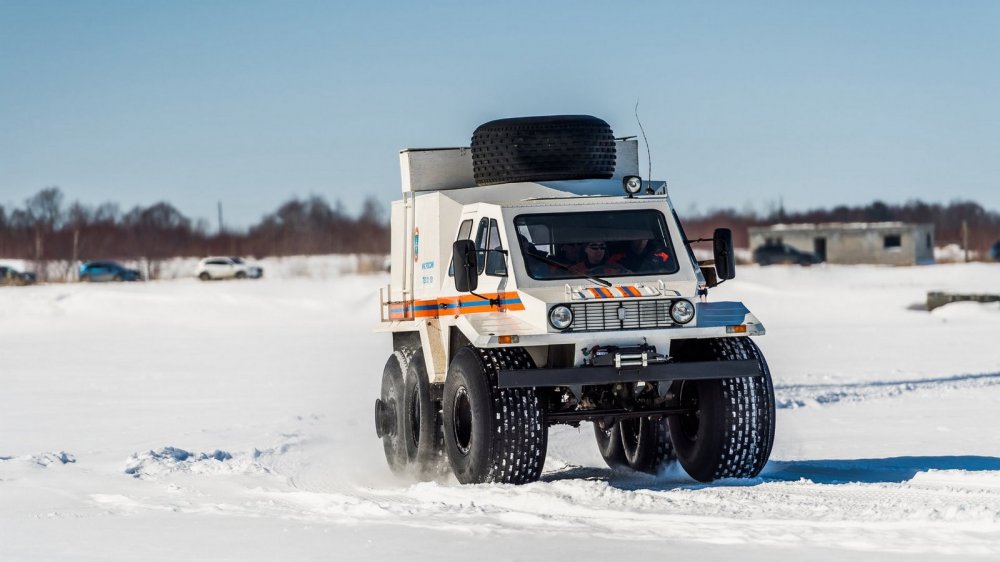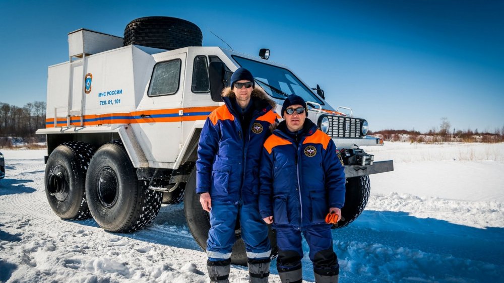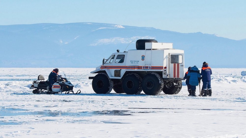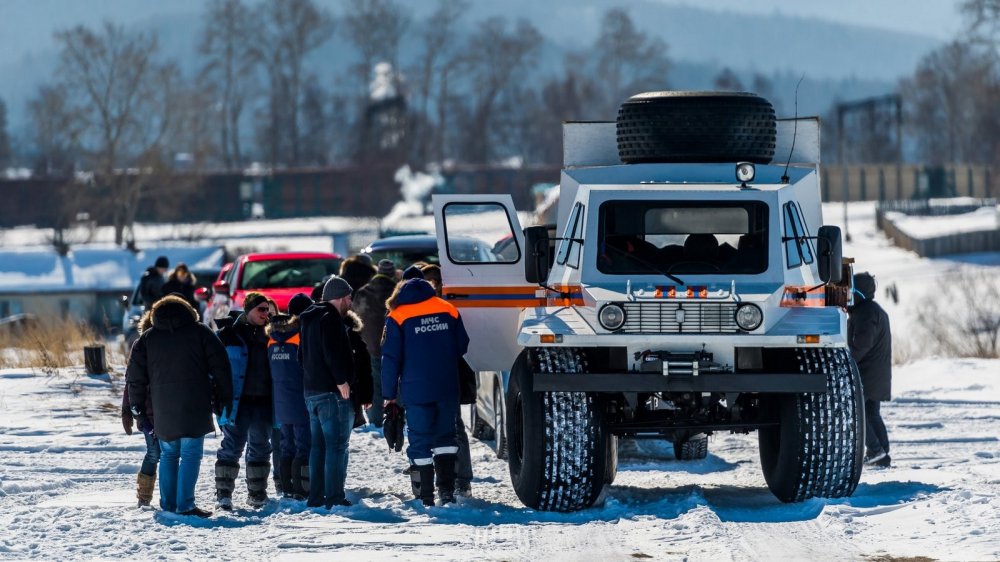 Именно этот прием предстояло осваивать и нам, после того как, познакомившись с достопримечательностями музея в Танхое, мы развернулись и проехали 40 километров в обратном направлении, до деревни Клюевка. Дело в том, что нынешняя зима на Байкале выдалась очень снежной, и организаторы просто не смогли найти в Танхое места, где кроссоверы могли бы нормально съехать на Байкальский лед, что увеличило дистанцию, которую нам предстояло пройти, до 62 километров. В Клюевке нас ждали сотрудники местного МЧС с трехосным ТРЭКОЛом, который должен был выступить в роли атомного ледокола, ведущего караван судов во льдах Арктики, и снегоходом, которому предстояло играть роль вертолета ледовой разведки. Выходу на лед предшествовал интенсивный инструктаж. С одной стороны, серьезные мужики из МЧС заверили, что лед — прочный, толщина его местами превышает метр, так что переправа даже танки выдержит. А с другой, лед — стихия коварная, так что дистанцию в 25 метров между автомобилями нужно соблюдать неукоснительно. И вот момент старта… Сразу обратил внимание, что траектория движения очень сильно отличалась от прямой линии, соединяющей Клюевку с Листвянкой. Конвой двигался этаким «противолодочным зигзагом», обходя проблемные места, прежде всего — зоны торосов и застругов.