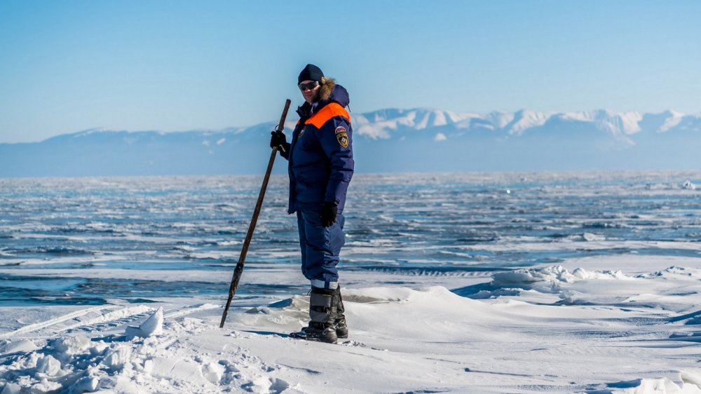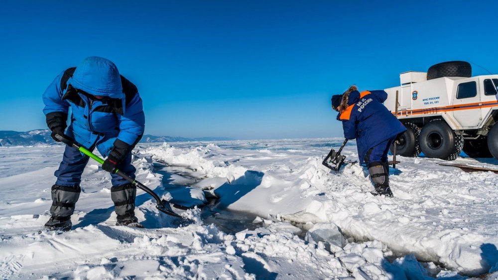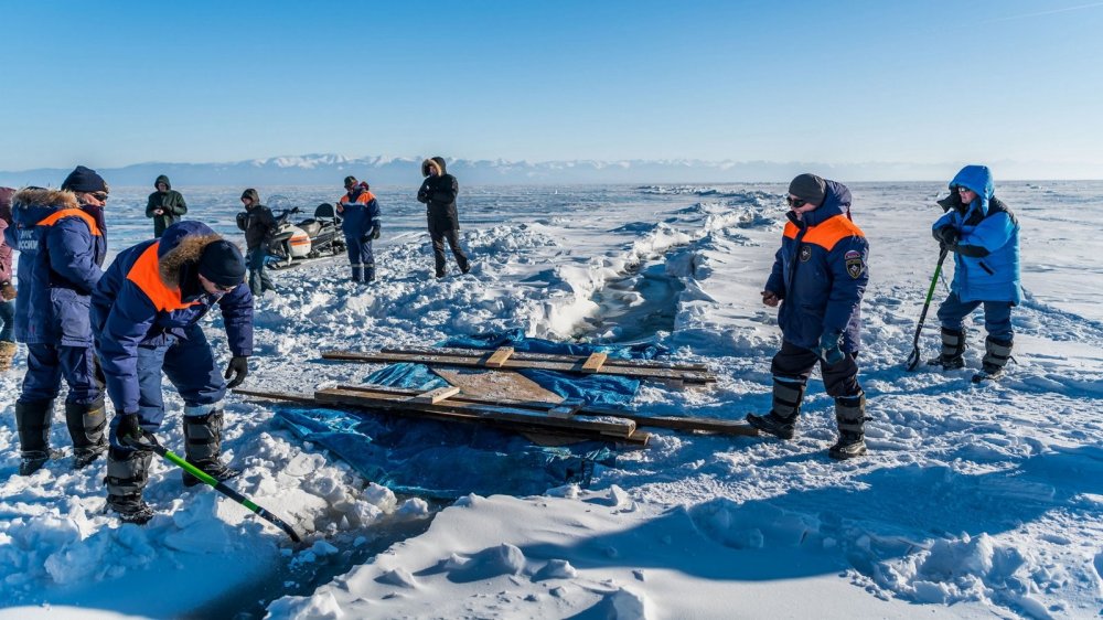 Ну а самыми серьезными препятствиями стали две обрамленные торосами трещины. Как рассказали сотрудники МЧС, они тянутся вдоль всего Байкала, от самой северной до самой южной его точки. Своим происхождением они обязаны господствующим ветрам, сталкивающим ледяные поля и превращающие их гряды жестких, как зубья, надолбов. Вот тут организаторам понадобились ломы, бензопилы и прихваченные с собой дощатые мостки. Кстати, именно эти трещины стали самой серьезной проблемой зимой 1904 года, когда все повисло на волоске, и снабжение сражающихся в Маньчжурии русских войск зависело от возможности перемещения вагонов через Байкал по проложенным на льду временным рельсам. Ширина трещин под рельсовым путём доходила до полутора метров, а сила движения льда была настолько велика, что рельсы лопались, а болты и скрепления разлетались в стороны.