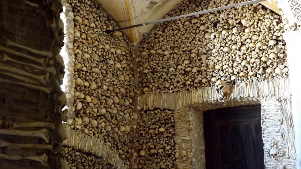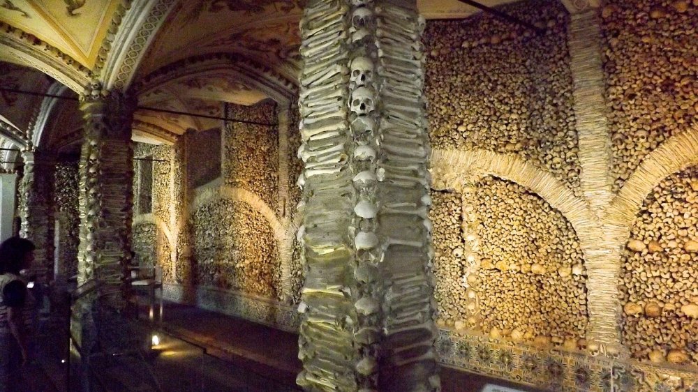 В этом же здании — музей церковного искусства и костюма. А по соседству — самая мрачная (на взгляд человека XX-XXI века) достопримечательность Эворы, церковь Сау-Франсишку со знаменитой Капеллой костей, стены которой целиком построены из костей как минимум пяти тысяч умерших монахов. Надпись над входом гласит: Nos ossos que aqui estamos, Pelos vossos esperamos («Мы, лежащие здесь кости, ожидаем прихода ваших»). Помни о смерти, человек…