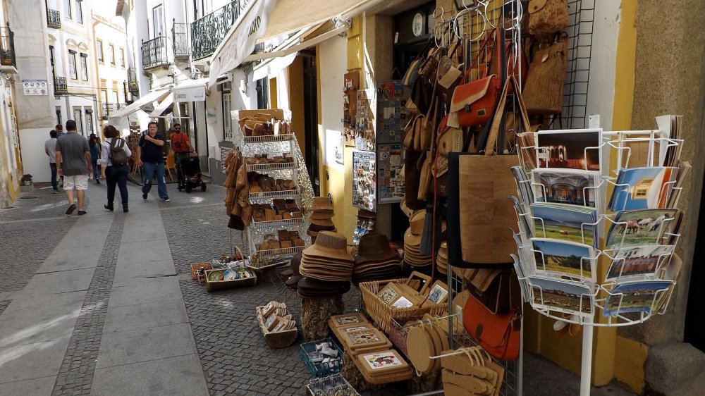 Нужно сказать, что в Португалии сохранилось не так уж много построек того периода, когда эта земля была римской провинцией под названием Лузитания. А еще Эвора — это центр провинции Алентежу. Местность вокруг гористая, и именно здесь растут знаменитые пробковые дубы, кора которых является одним из традиционных предметов португальского экспорта. Здесь из пробки навострились делать массу всяких вещей, от обоев и кухонных подставок под горячее до бейсболок, сумочек, кошельков и обуви. В туристических местах полно магазинчиков Cork All, то есть «Все из пробки».