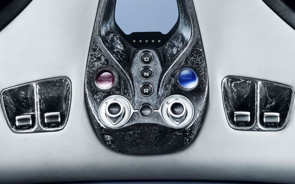 Водителя окружают целых пять дисплеев, два крайних их которых выполняют функцию зеркал заднего вида, то есть выводят картинку с выдвижных наружных камер, расположенных за передними колёсными арками. Управление трансмиссией вынесли на потолок: соответствующие кнопки гнездятся в «люстре» из высокохудожественного карбона (это когда деталь не несущая, и волокна можно расположить под любым углом, чтобы на выходе получить уникальный рисунок плетения – такими деталями уже несколько лет радует своих клиентов фирма Lamborghini). Противосолнечных козырьков нет – их роль выполняют электрохромные секции стеклянного колпака, накрывающего салон.