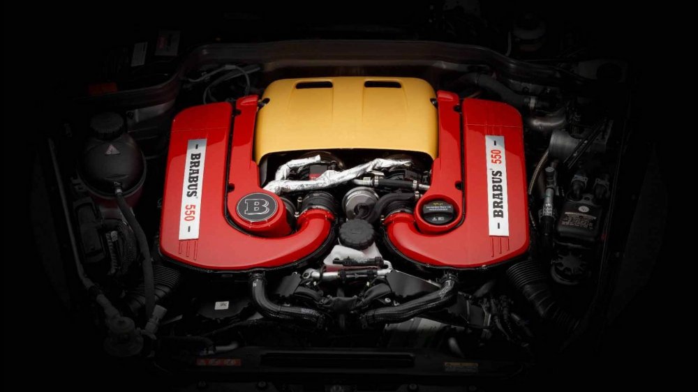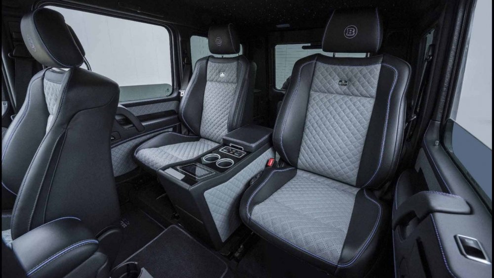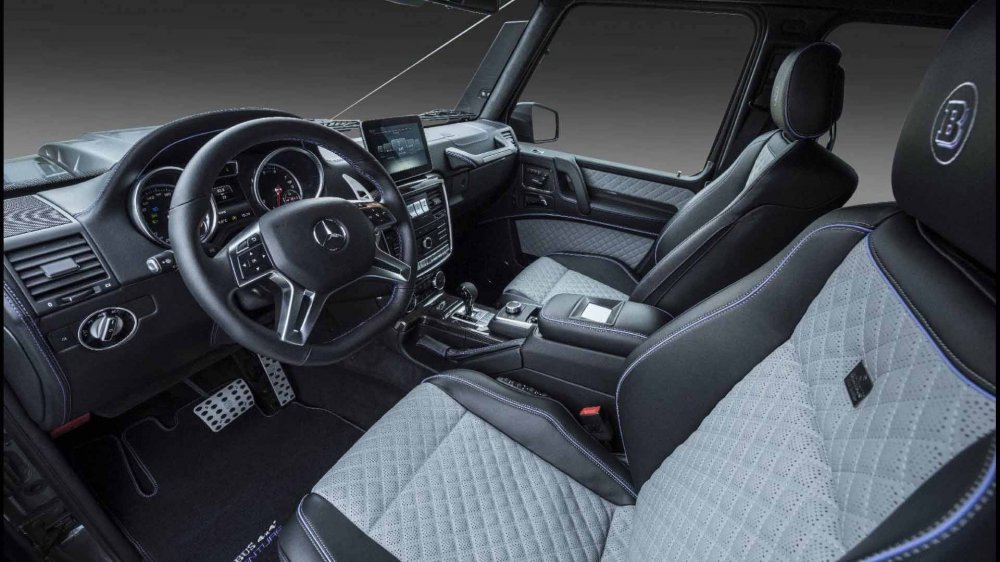 Салон автомобиля оформлен с использованием высококачественной кожи с перфорированными вставками и контрастной прострочкой. На педалях фирменные накладки Brabus, на полу брендированные коврики и на подголовниках вышитые логотипы.