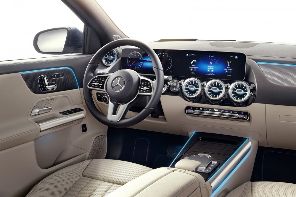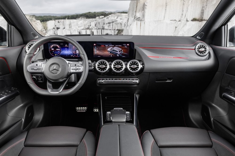 С места водителя новый GLA мало чем отличается от других современных Мерседесов с поперечным расположением силового агрегата: то же широкоформатное двухэкранное «табло», та же мультимедийная система MBUX с нарядной графикой, тот же узенький блок микроклимата, те же круглые дефлекторы системы вентиляции в авиационном стиле. Далее со всеми остановками. Разница сводится к нюансам оформления корпуса передней панели и дверных карт.