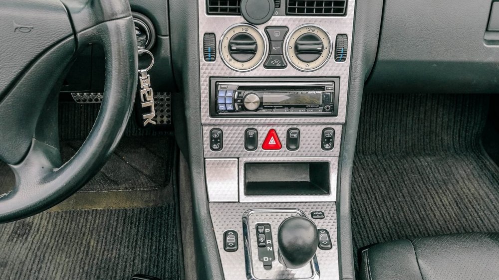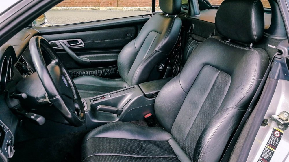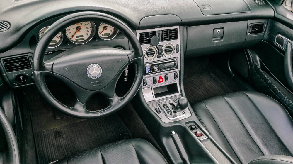 Молодежным интерьер SLK может считаться только на фоне своих чопорных родственников. Лишь блеск алюминия на центральной консоли и белизна приборных шкал оживляют затянутый в чёрную кожу салон. Более изящный, чем изначально было задумано, руль и скругленная верхняя часть передней панели нисколько не влияют на восприятие — это Mercedes эпохи лихих 90-х. Прецизионно собранный, пышущий «настоящим немецким качеством». В разумно достаточной комплектации, с минимальным электропакетом и двухзонным климат-контролем. Со своими объемными дверными карманами, нишами под мелочь, бардачками и маленьким, зато правильной формы багажником, покоряющий вовсе не обязательной практичностью.