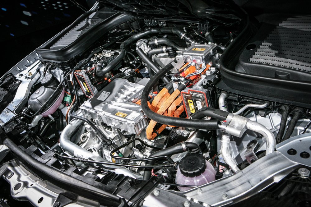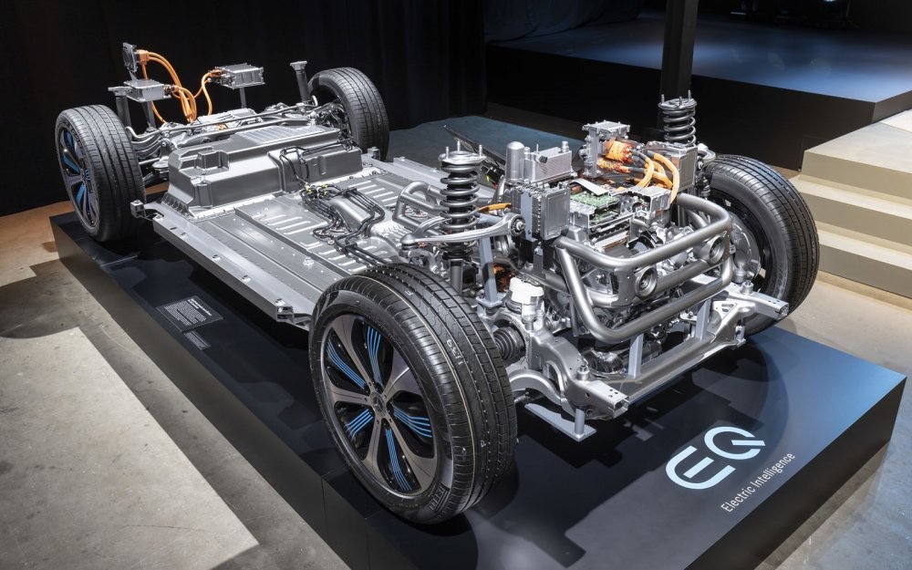 Итак, месяц назад из официальных источников мы узнали, что EQC построен на модифицированной платформе кроссовера GLC (колесная база 2873 мм), но при этом имеет более вытянутый кузов (длина 4761 мм). Родство с моделью, рассчитанной на использование ДВС, привело к тому, что у EQC нет привычного для электромобилей дополнительного переднего багажника: все подкапотное пространство занимает мощная трубчатая рама, на которую крепится электродвигатель и блок силовой электроники. Особенно умилительно выглядит аппендикс, повторяющий контуры гидромеханической АКП, которой, понятно, у EQC нет. В общем, компоновка, прямо скажем, не очень изящная, особенно для фирмы, которая исторически славится всевозможными техническими прорывами, в том числе в области кузовостроения.