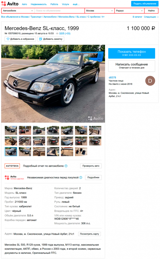 Разумеется, стильный кабриолет должен был быть также комфортным, а по запросу – еще и быстрым. Первое условие выполнялось за счет прекрасной подвески, которая могла вдобавок быть активной, ну а второе – разумеется, прежде всего благодаря широкому спектру двигателей. Базовой во все времена была рядная «шестерка», а за доплату можно было получить и настоящий V8 на 5 литров. К примеру, вот этот экземпляр черного цвета одного из последних годов выпуска не только хорошо сохранился, но и щеголяет пятилитровым мотором M113, входящим в число надежных и удачных мерседесовских агрегатов. По заверению владельца, пробег слегка превышает 200 тысяч километров, и в наличии имеются даже сервисные документы, а цена автомобиля – 1,1 миллиона рублей.