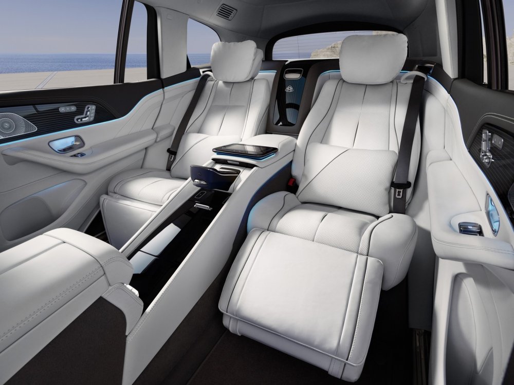 Второй ряд может быть трёхместным, либо двухместным – с вместительной, разделяющей кресла перегородкой с холодильником, куда влезают три бутылки игристого по 0,75 л каждая. Для фужеров есть отдельная ниша, причём с подогревом, на случай если барин предпочитает на завтрак кофе, а не шампанское. По сравнению с обычным GLS задние кресла сдвинуты на 120 мм назад и на 30 мм от дверей, чтобы было больше места для ног и локтей соответственно. Запас пространства в коленях при стандартном положении кресел – 1103 мм, а для директорского правого заднего кресла он увеличивается до 1340 мм, если отодвинуть вперёд кресло телохранителя. Оттоманки для ног входят в базу даже при пятиместном варианте, спинки откидываются назад на максимальные 43,5 градуса, обеспечивая достаточно удобную позу для сна. Подогрев, вентиляция и массаж, конечно же, доступны.
